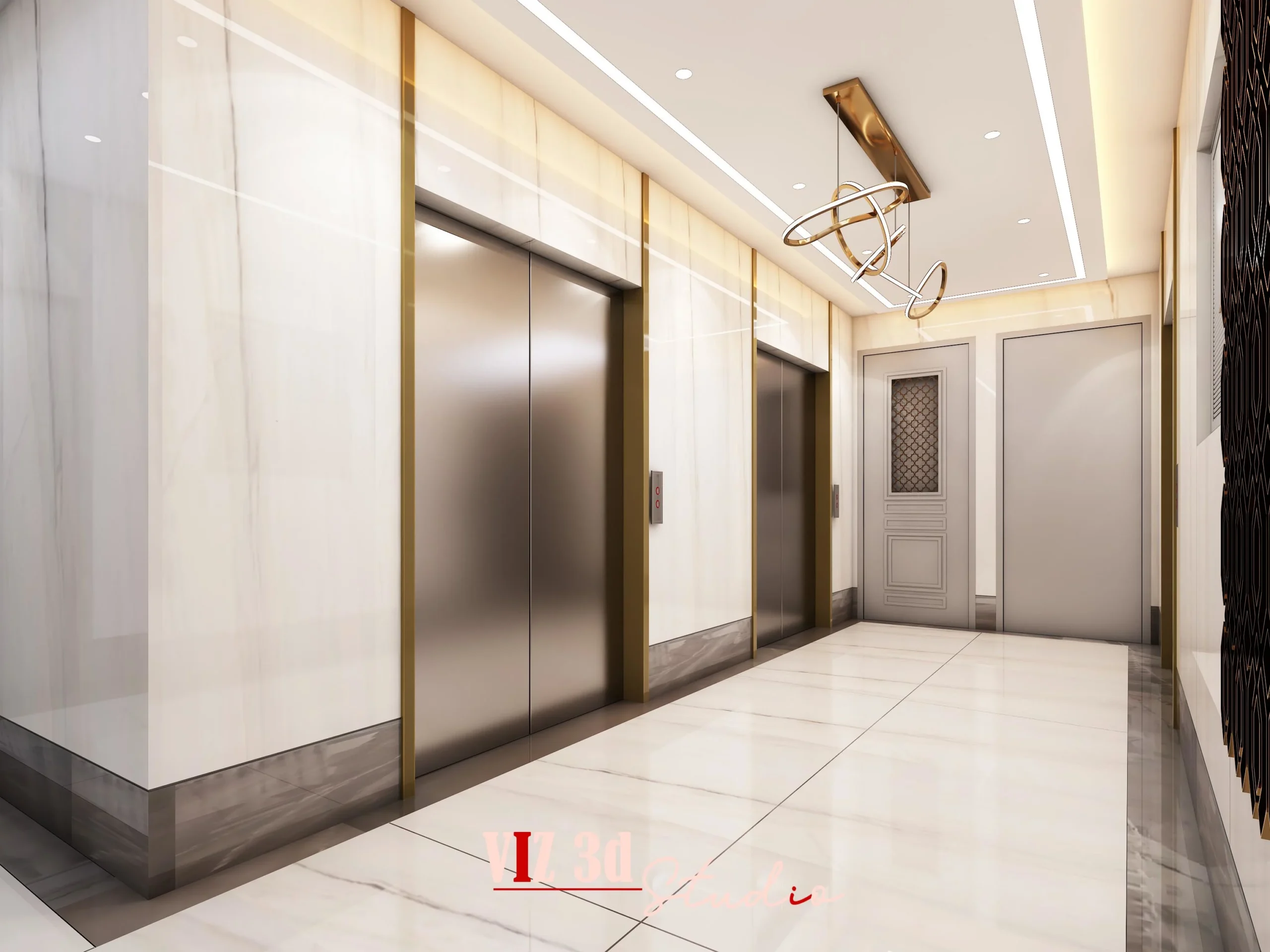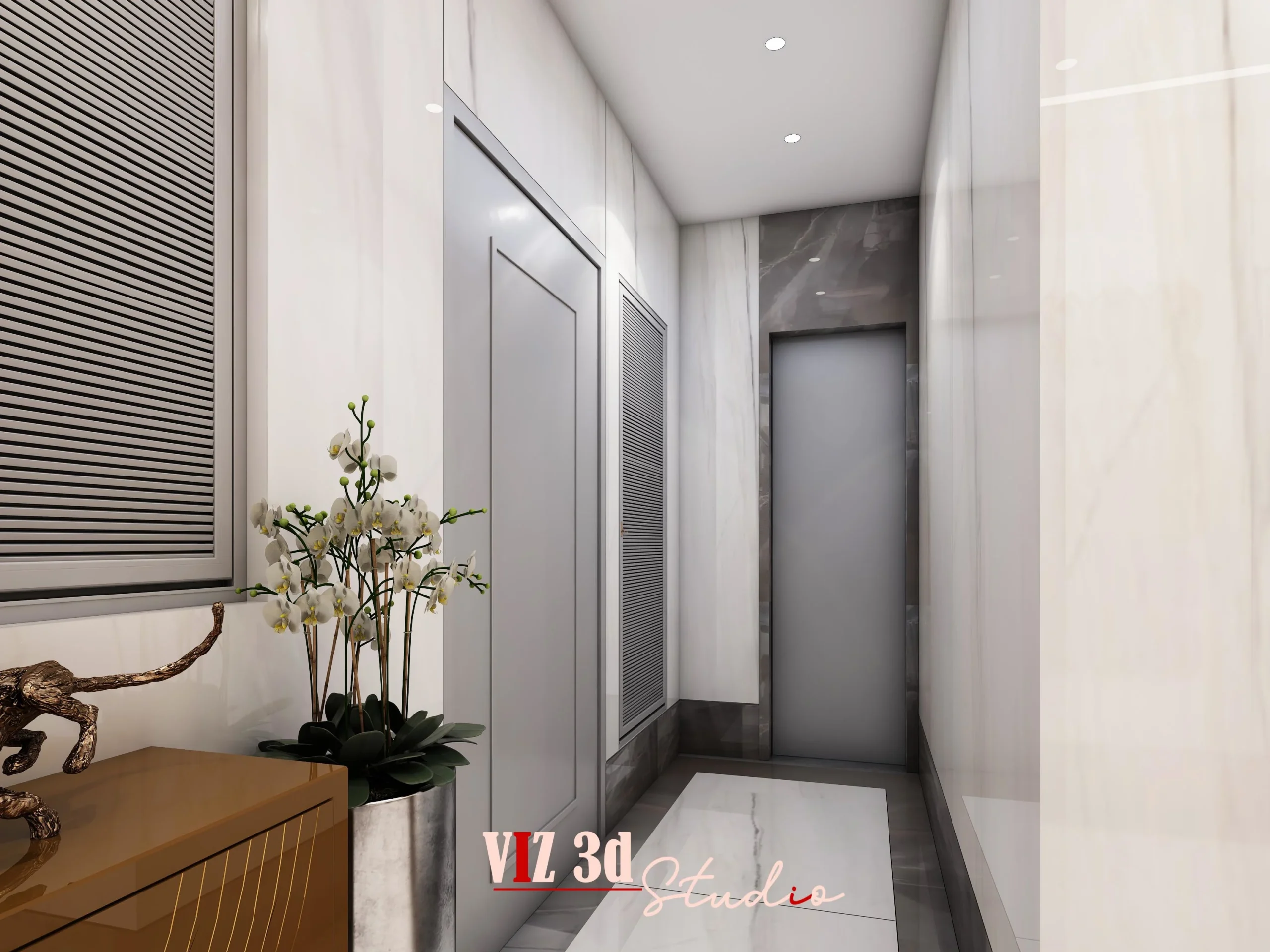 This commercial entrance lobby was visualized to reflect a modern, luxurious, and functionally refined spatial experience, delivered entirely through our 3D modeling, texturing, lighting, and high-quality rendering expertise. The design concept blends symmetry, premium materials, and soft ambient lighting to create a sophisticated first impression suitable for a high-end commercial environment. Realistic marble flooring brushed metallic finishes, warm gold accents, and sculptural wall details were crafted with precise geometry and accurate material mapping, while HDRI-based lighting and carefully balanced shadows ensured a clean, polished visual outcome. Camera angles were selected to highlight depth, proportion, and the richness of textures such as metal reflections, ceiling coves, and decorative elements. Despite challenges like achieving uniform light distribution and seamless material transitions, the final renders successfully captured the intended elegance, helping the client present a clear and compelling vision of their space.