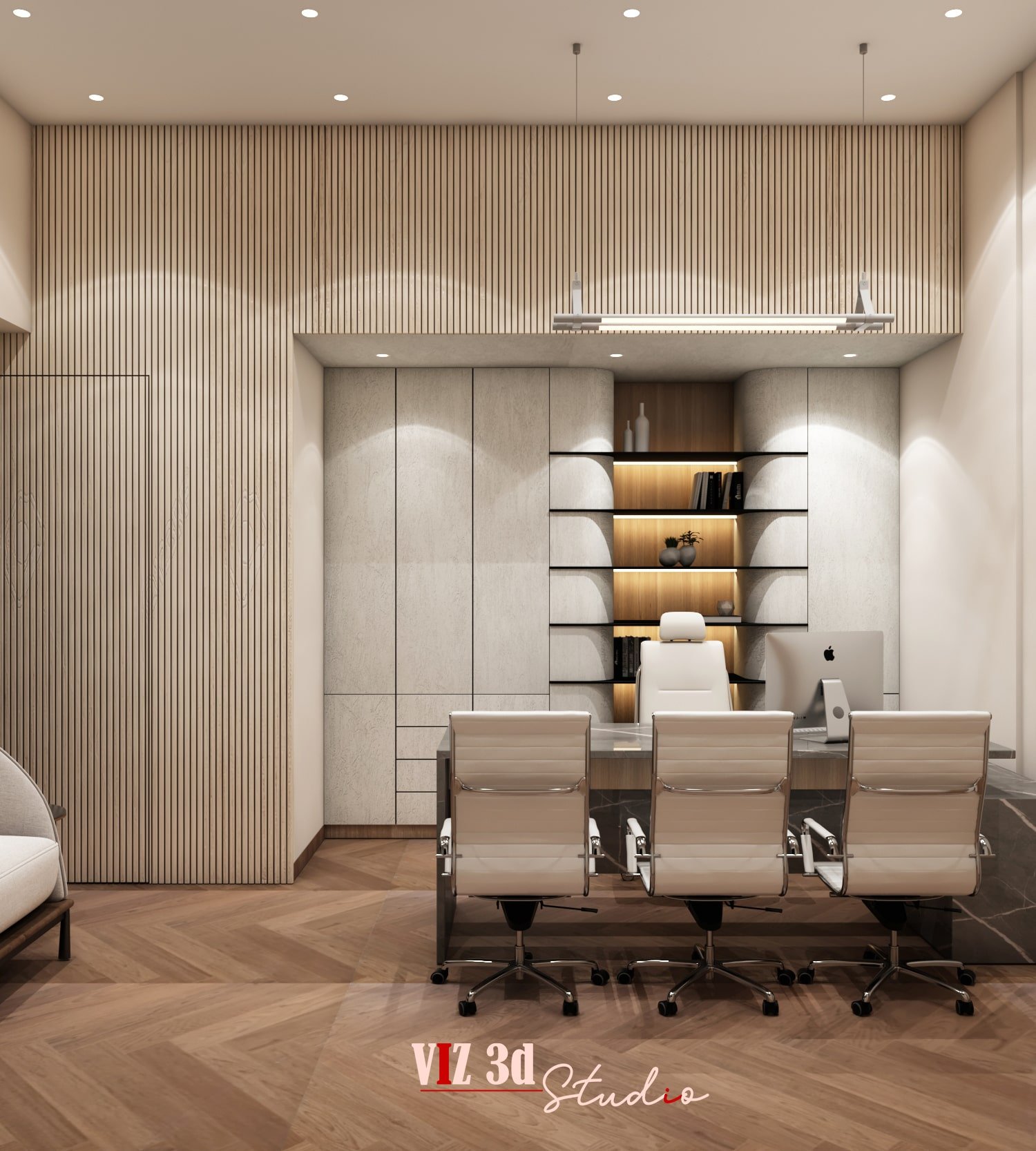MD’s Cabin is a clean, modern interior visualization designed to represent a professional executive workspace through high-quality 3D visualization and 3D architectural visualization. The concept focuses on minimalism, balance, and functionality, using vertical wooden slat walls, integrated storage, and a well-composed workstation to create a refined cabin environment. Realistic materials such as warm wood, matte cabinetry, polished surfaces, and detailed upholstery enhance authenticity, while layered recessed and accent lighting adds depth and a calm, welcoming mood. Eye-level camera composition highlights symmetry, proportions, and spatial clarity. Subtle details like fabric textures, soft reflections, glass transparency, and herringbone flooring elevate realism. The warm neutral color palette delivers a modern, luxurious aesthetic, resulting in a visually strong presentation that supports the client’s brand and design intent.