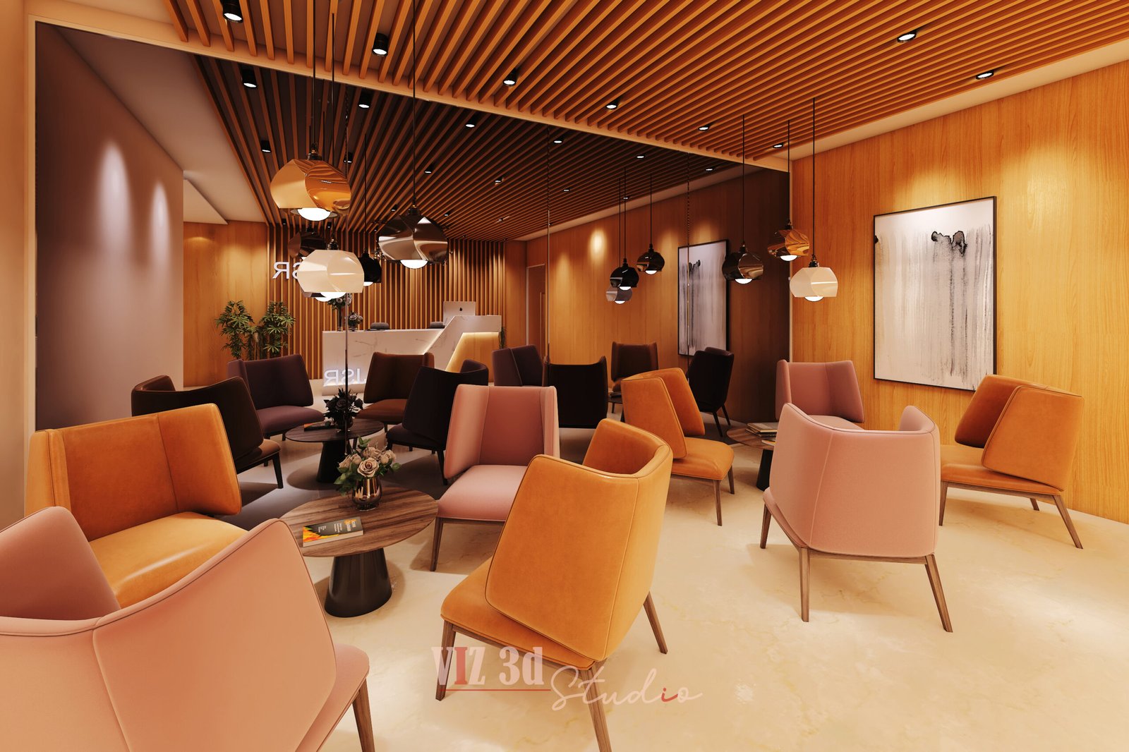 This 3D architectural rendering for the JSR OFFICE RECEPTION AREA delivered a high-impact architectural visualization 3D reflecting the architecture designer’s sophisticated commercial concept. The design utilizes a warm, inviting palette based on rich wood tones for wall paneling and ceiling slats, contrasted with white marble elements for the reception desk and flooring.