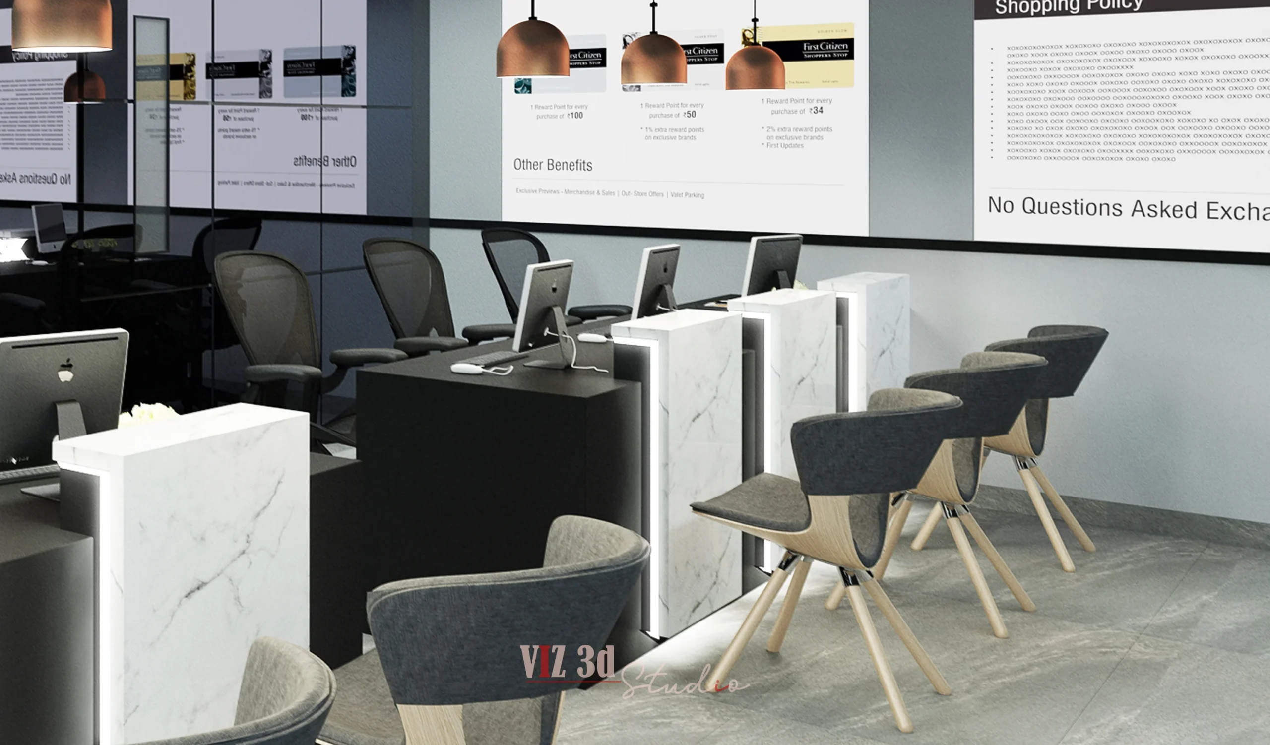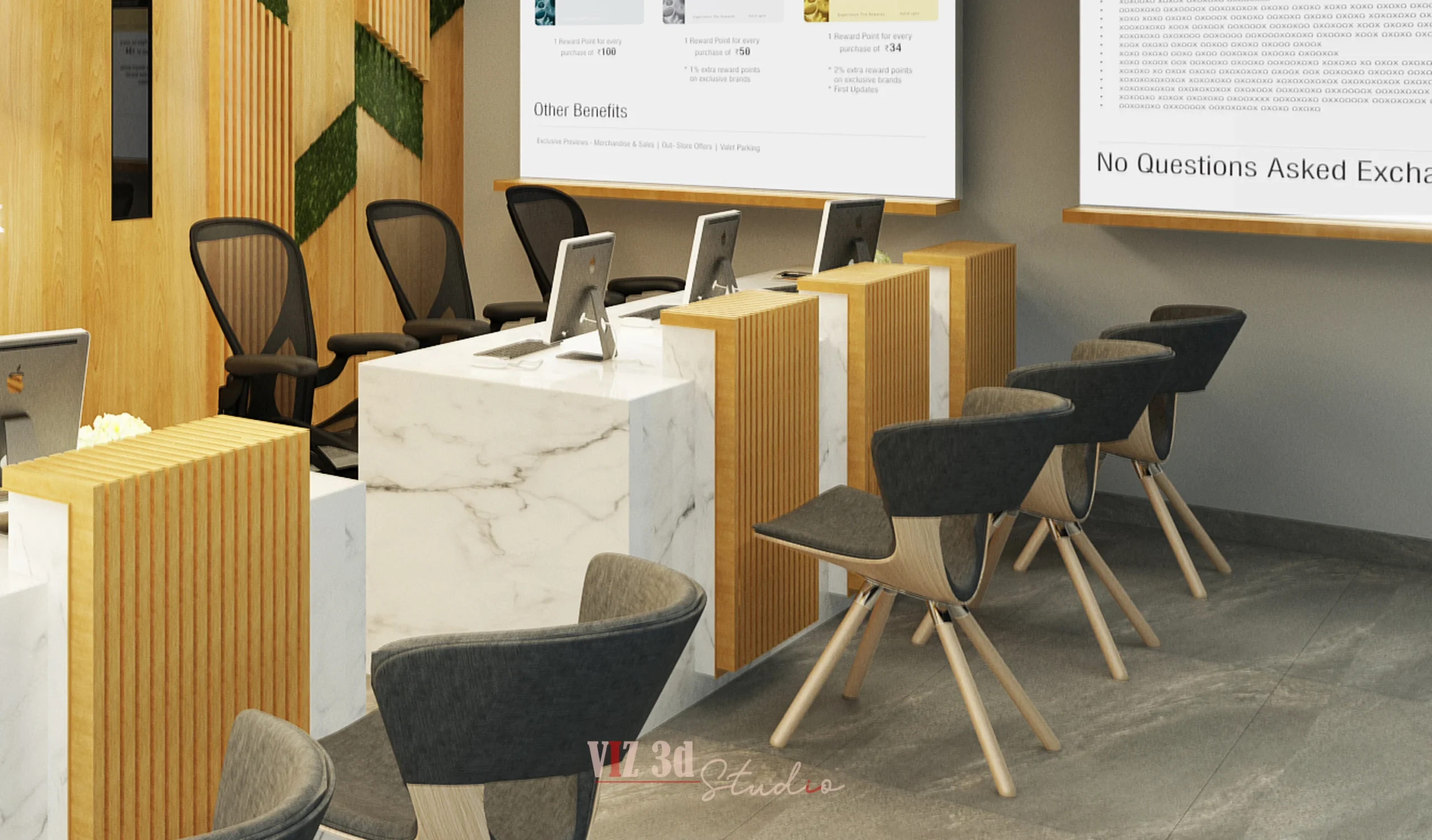 We provided a high-fidelity 3d architectural rendering for the SHOPPERS STOP CUSTOMER DESK, ensuring the commercial design reflected the brand’s contemporary image and providing a functional architectural visualization 3d. The objective was to clearly showcase the desk, seating, and illuminated signage, as designed by the architecture designer.