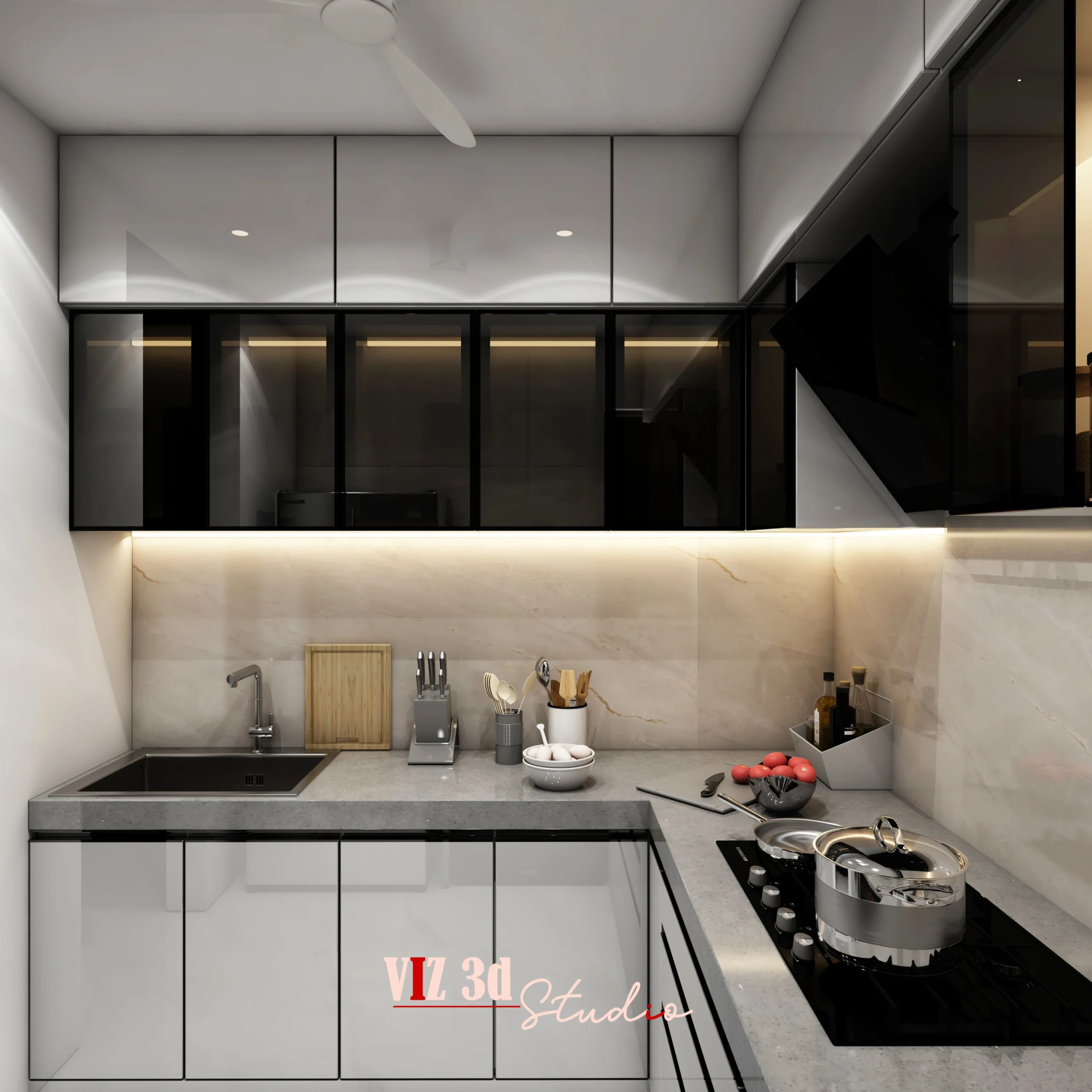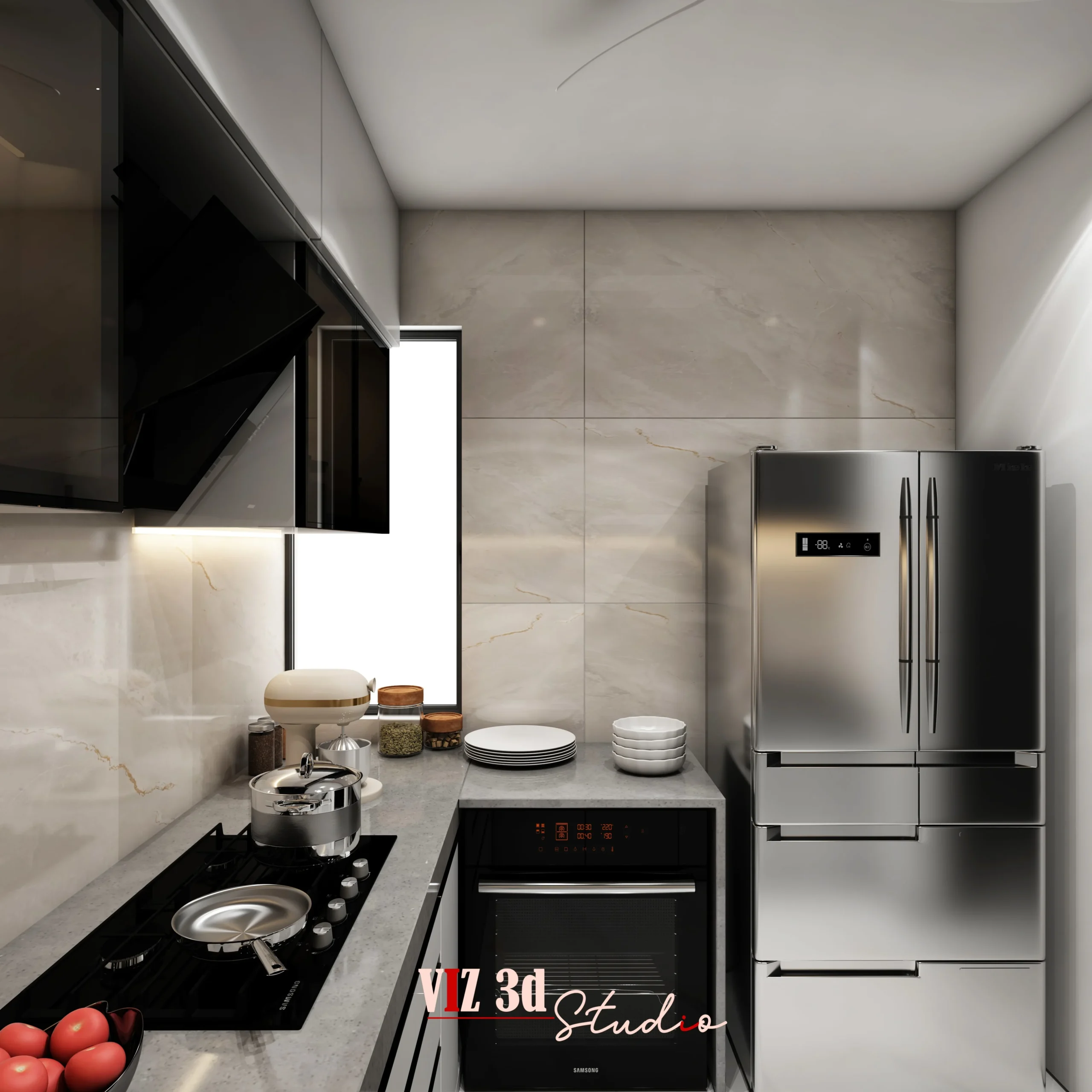 The Kitchen 3D visualization project showcases a modern, clean, and highly functional kitchen designed to help the client visualize the final space with clarity and realism through professional 3D visualization and 3D architectural visualization. The layout features a well-planned L-shaped configuration with sleek upper and lower cabinets, integrated appliances, and efficient work zones. High-gloss cabinetry, stone-textured backsplash, matte countertops, and metallic accents are enhanced through detailed texture mapping and realistic reflections. Soft HDRI daylight combined with recessed and under-cabinet lighting creates depth, balance, and a warm working ambiance. Eye-level camera angles highlight proportions and workflow, while minimal props add realism. The neutral grey, white, and beige palette delivers a modern, premium aesthetic, resulting in a polished visual that strengthens presentation quality and client confidence.