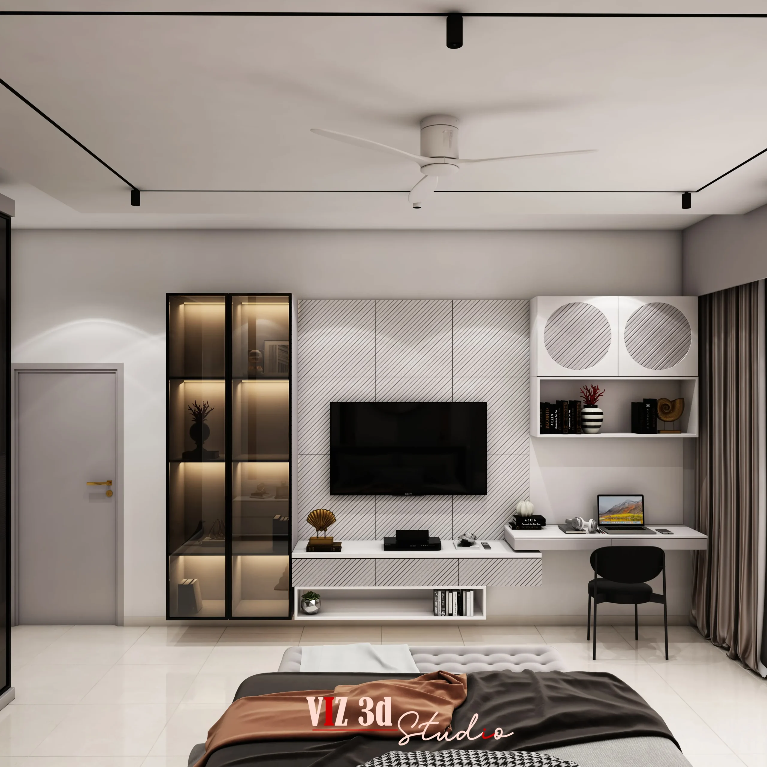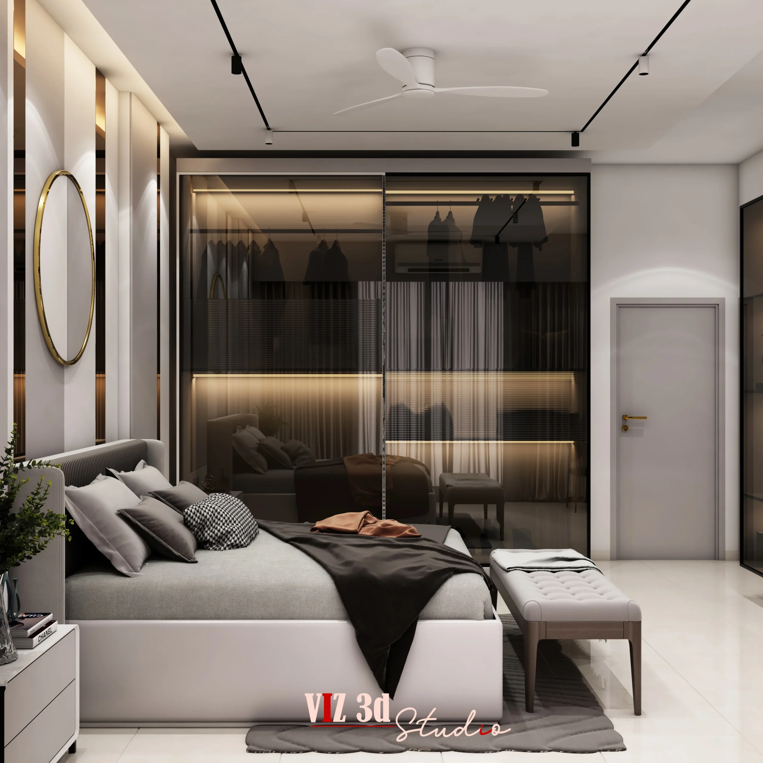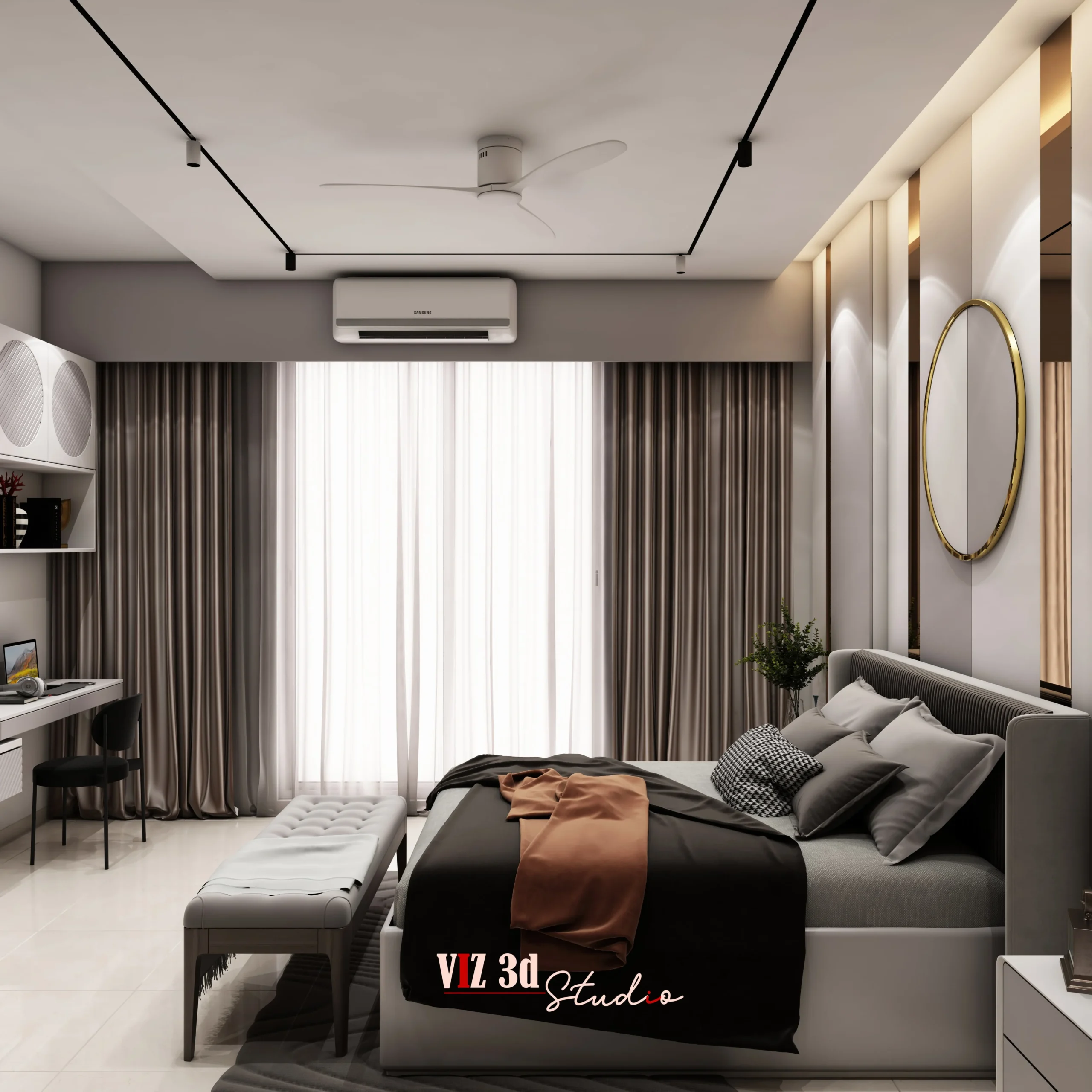 The MASTER BEDROOM project is a refined 3D visualization created to help the client clearly understand the spatial layout, materials, lighting, and overall ambience before execution. Designed with a modern luxury approach, the visualization focuses on balanced space planning, featuring a centrally aligned bed, sleek bedside units, a soft upholstered bench, and a visually striking yet minimal feature wall. Realistic material texturing highlights fabric upholstery, matte wall panels, polished flooring, and subtle metallic accents, enhancing depth and realism. Soft ambient and indirect lighting creates a warm, calming atmosphere while emphasizing architectural lines and surface details. Carefully composed camera angles showcase symmetry and proportions, while high-quality 3D architectural visualization rendering ensures crisp details, natural reflections, and a premium finish. The final output delivers strong visual clarity, helping the client confidently present the design and move forward with precision and trust.
