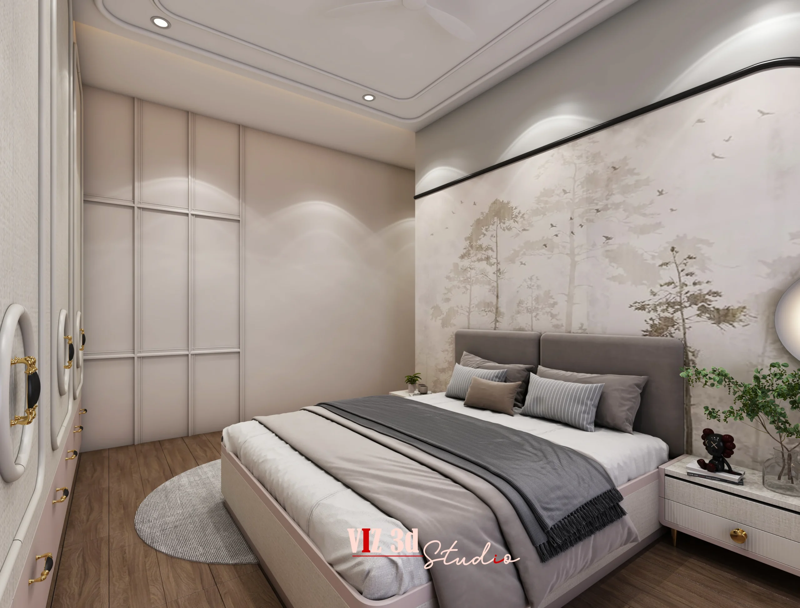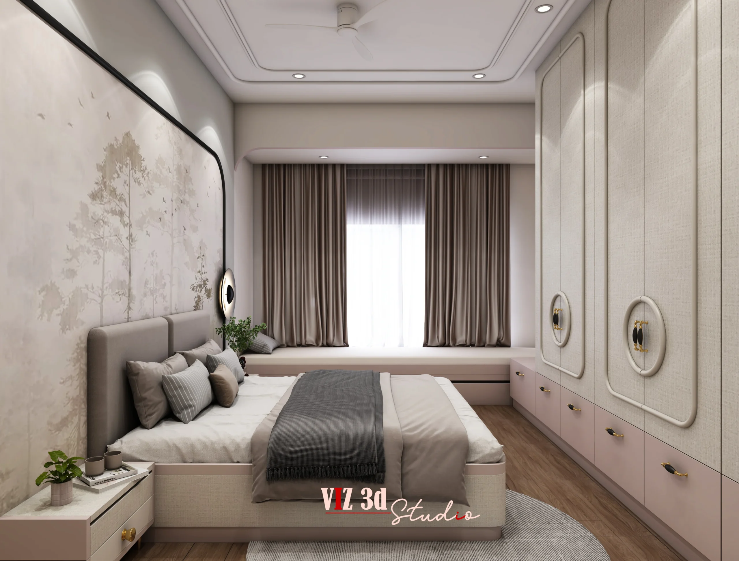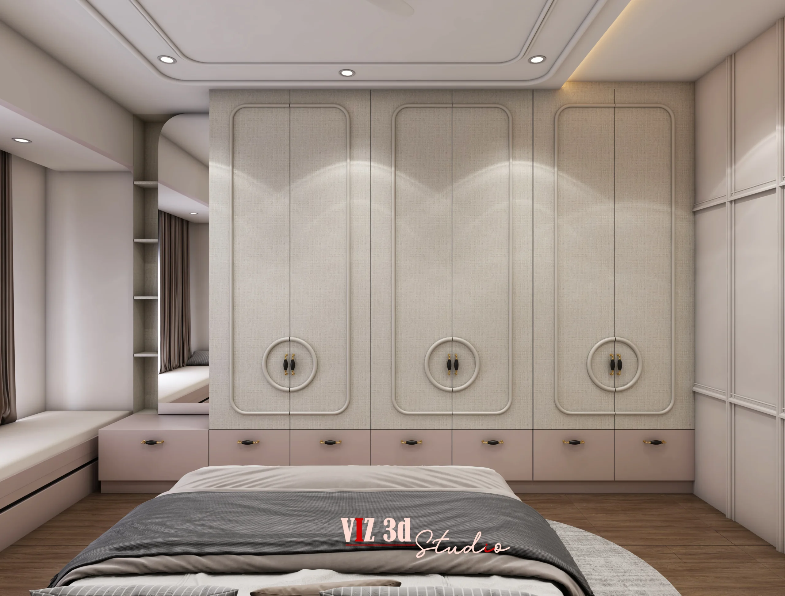 The Master Bedroom residential project was developed to deliver a refined, calm, and highly functional private space through detailed 3D architectural visualization. The client partnered with our 3D rendering company to translate design intent into realistic visuals that clearly communicate layout, materials, lighting, and overall ambience before execution. The visualization focuses on balanced space planning with a central bed feature, integrated wardrobes, and built-in seating, ensuring both comfort and efficient circulation. Soft neutral materials, fabric-textured surfaces, natural wood flooring, and subtle metallic accents were carefully mapped to achieve depth and realism. A layered lighting setup using indirect cove lights, wall washers, and natural daylight enhances mood, highlights textures, and creates gentle shadow transitions. Thoughtfully selected camera angles showcase room proportions, symmetry, and craftsmanship, while high-resolution rendering captures fine details such as fabric folds, surface reflections, curtain pleats, and precise finishes. The warm, minimal color palette reinforces a modern luxury aesthetic, resulting in a visually compelling presentation that supports confident client decisions and elevates the overall project value.