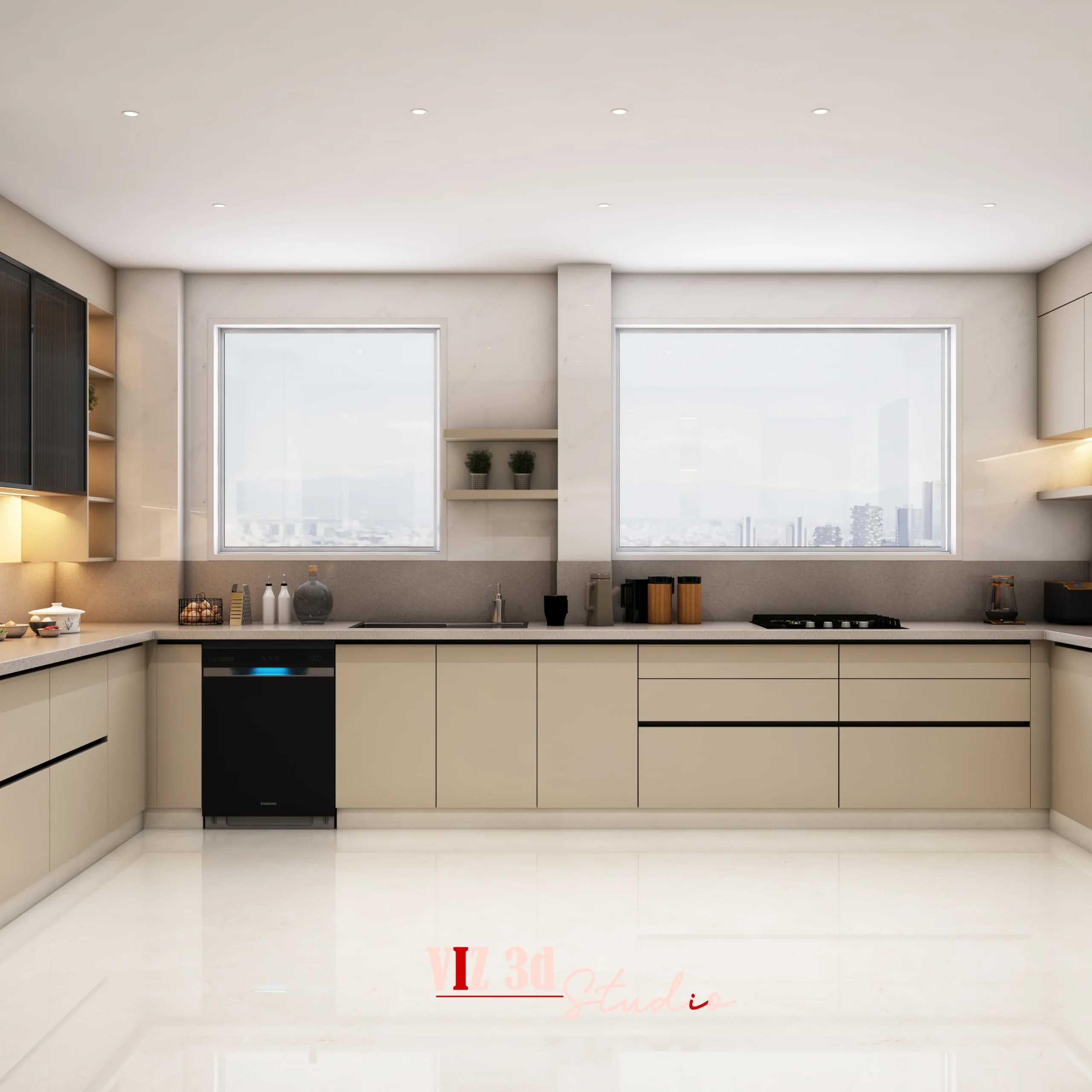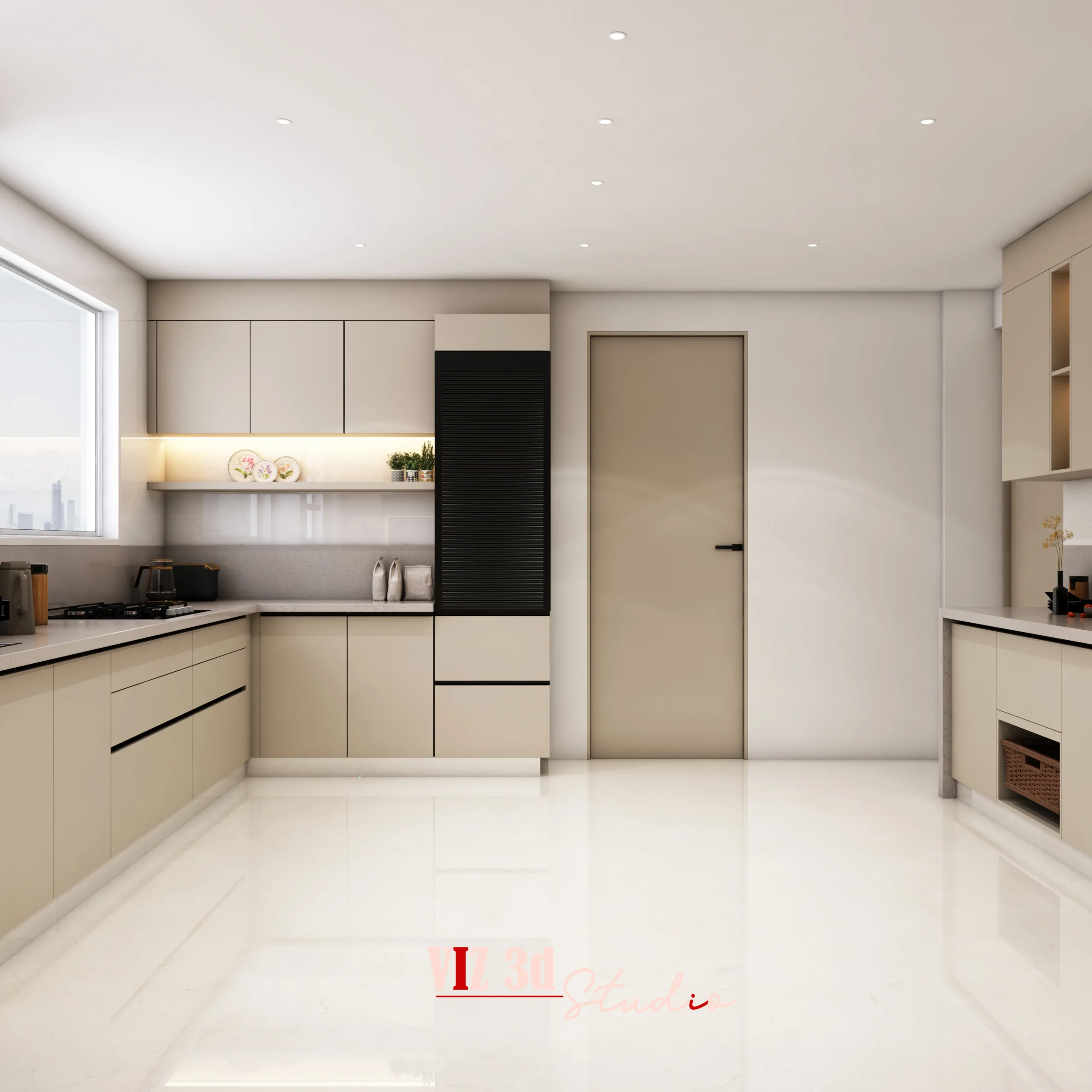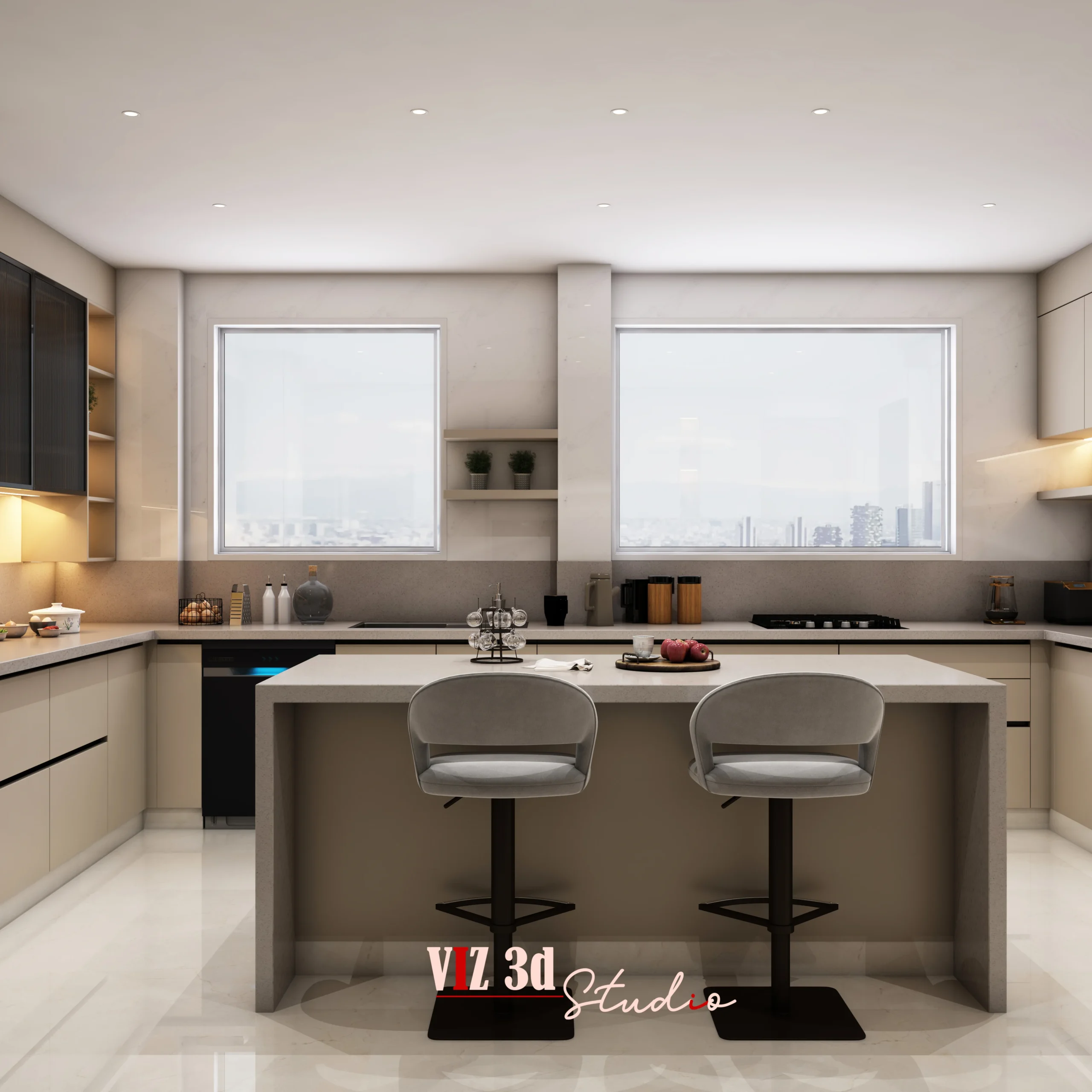 The Kitchen residential project was designed to present a modern, warm, and highly functional culinary space through precise 3D architectural visualization. The client wanted a clean U-shaped layout with a central island that balances storage, movement, and casual seating, which we developed with accurate proportions, integrated appliances, and seamless cabinetry detailing. As a professional 3D rendering company, we focused on matte beige finishes, subtle stone countertops, soft fabric bar stools, and realistic texture mapping to create depth and authenticity. Layered lighting using recessed spotlights, under-cabinet LEDs, and natural daylight simulation enhanced reflections on the glossy flooring and highlighted material contrasts without overpowering the scene. Carefully selected camera angles emphasized symmetry, spatial openness, and real-life perspective, while environmental elements like window city views, indoor plants, and countertop accessories added atmosphere. High-resolution rendering preserved fine details such as metallic appliance finishes, glass transparency, smooth edge alignment, and soft shadow transitions, resulting in a premium, presentation-ready visualization that helped the client confidently finalize design decisions and move forward with execution.