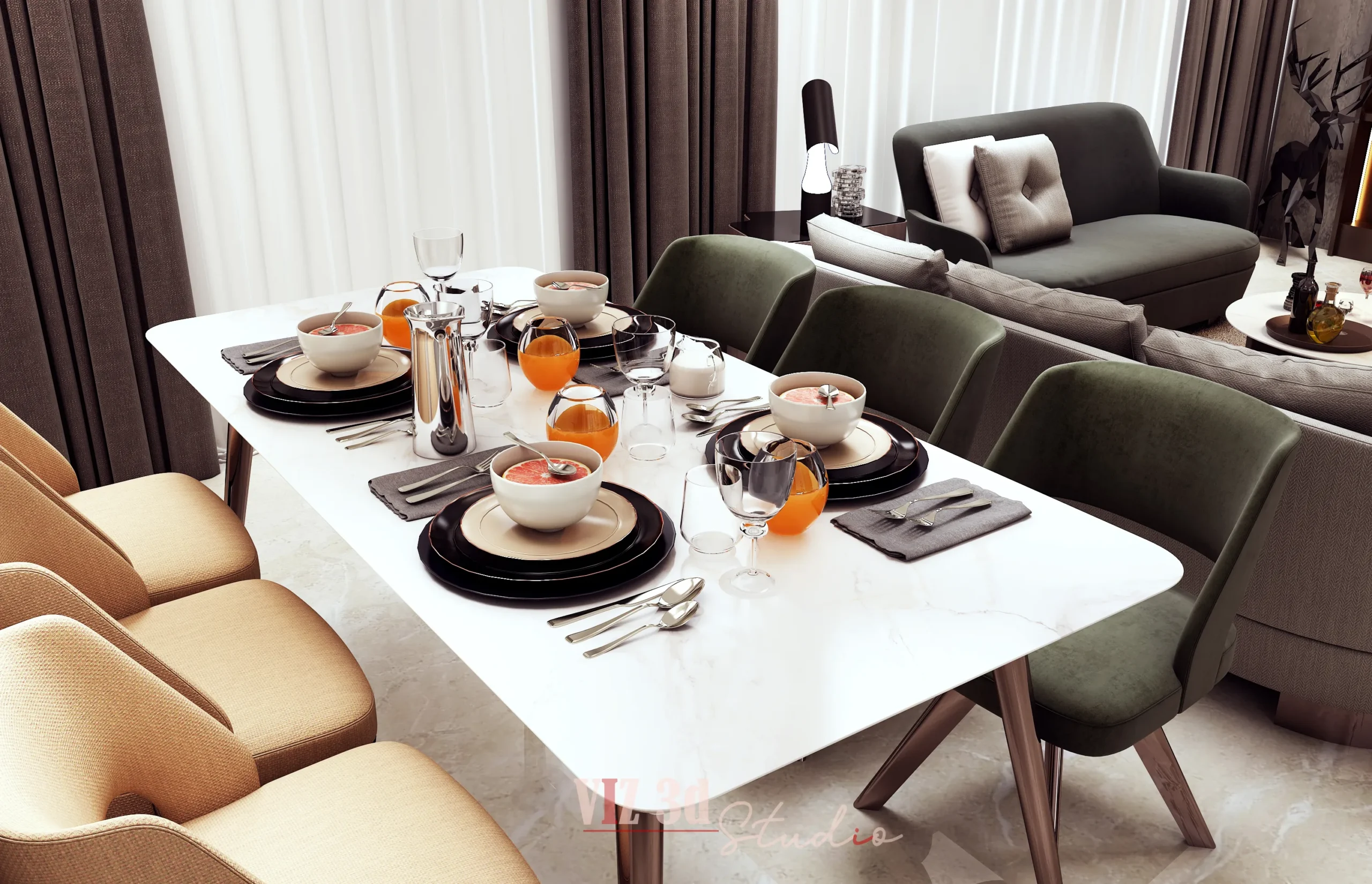 Materials include plush velvet and textured fabric on the curved sofas, sheer and heavy curtains (Image 1), and polished marble flooring. The lighting strategy combines general ambient ceiling light with warm, focused LED strips in the shelving, highlighting the sculptural deer accessories and the material depth. Camera angles frame the primary seating arrangement, emphasizing the conversation area. Visible details include the soft folds and texture of the curtains and sofa fabric, the gloss of the coffee table, and the smooth finish of the light-colored stone wall. The final output delivered a powerful visual concept for the architecture designer.