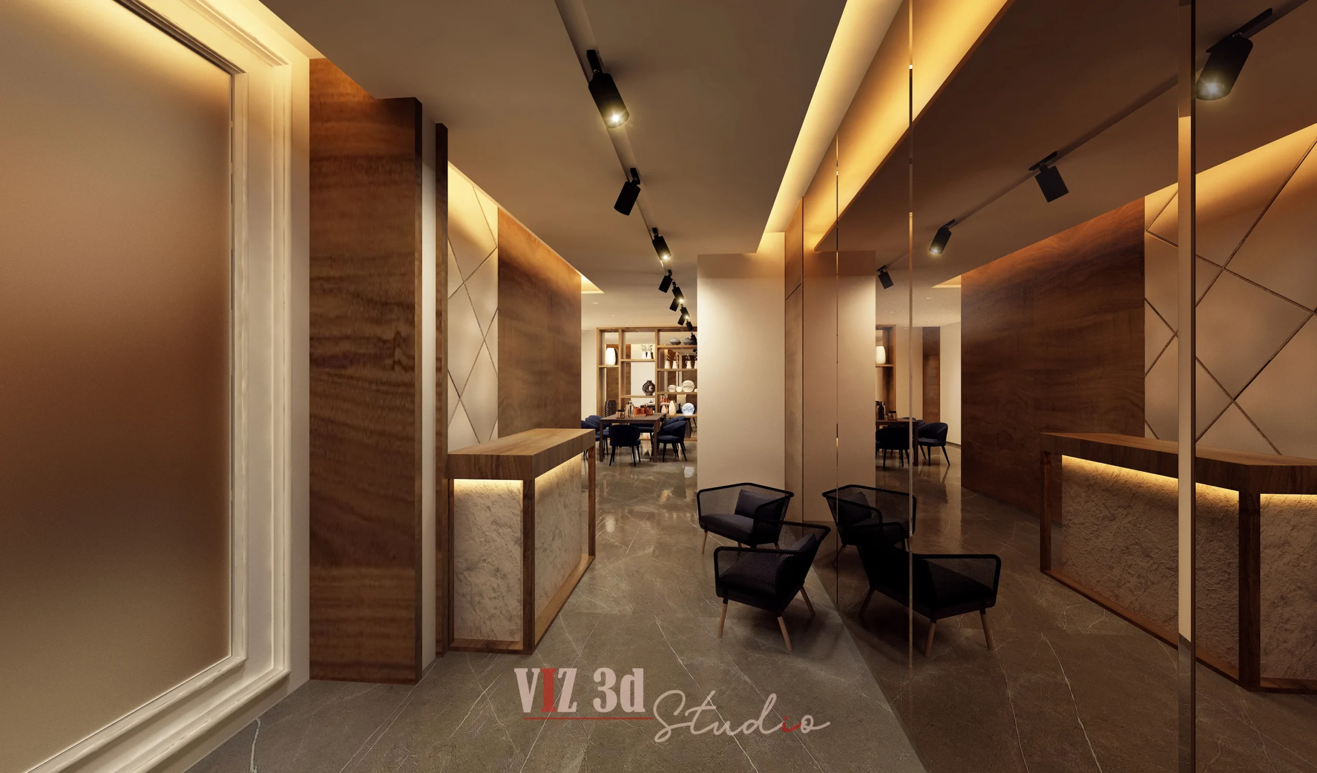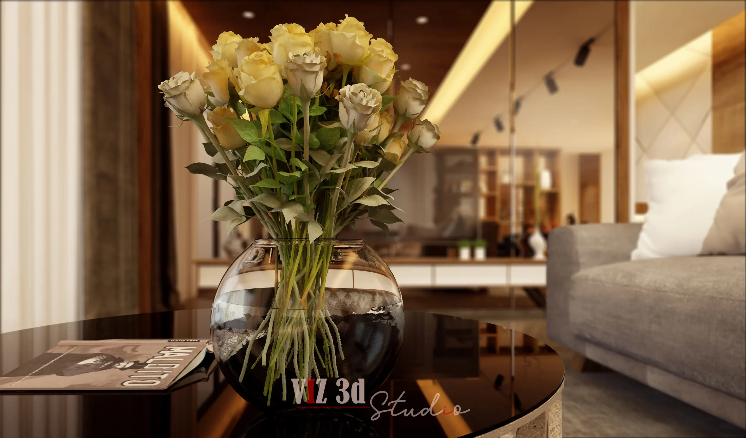 This architectural visualization 3d project showcases a luxury LIVING & DINING AREA, providing the client with photorealistic 3D rendering home views. Our objective was to accurately represent the modern, warm aesthetic. We utilized a rich palette of dark woods, neutral upholstery, and grey marble flooring, enhanced by recessed and track lighting (indirect lighting) to create a premium, inviting ambiance. The visualization focuses on intricate details like the soft depth of field on the yellow roses (4.jpg), the flawless glass transparency and metallic shine of the coffee table (1.jpg), and the precise texture mapping of the wooden ceiling panels. Strategic camera angles capture the expansive L-shaped sofa and the elegant dining setup (2.jpg), maximizing the spatial perception. The final high-resolution output delivered an impactful presentation quality, ensuring high client satisfaction and brand enhancement.