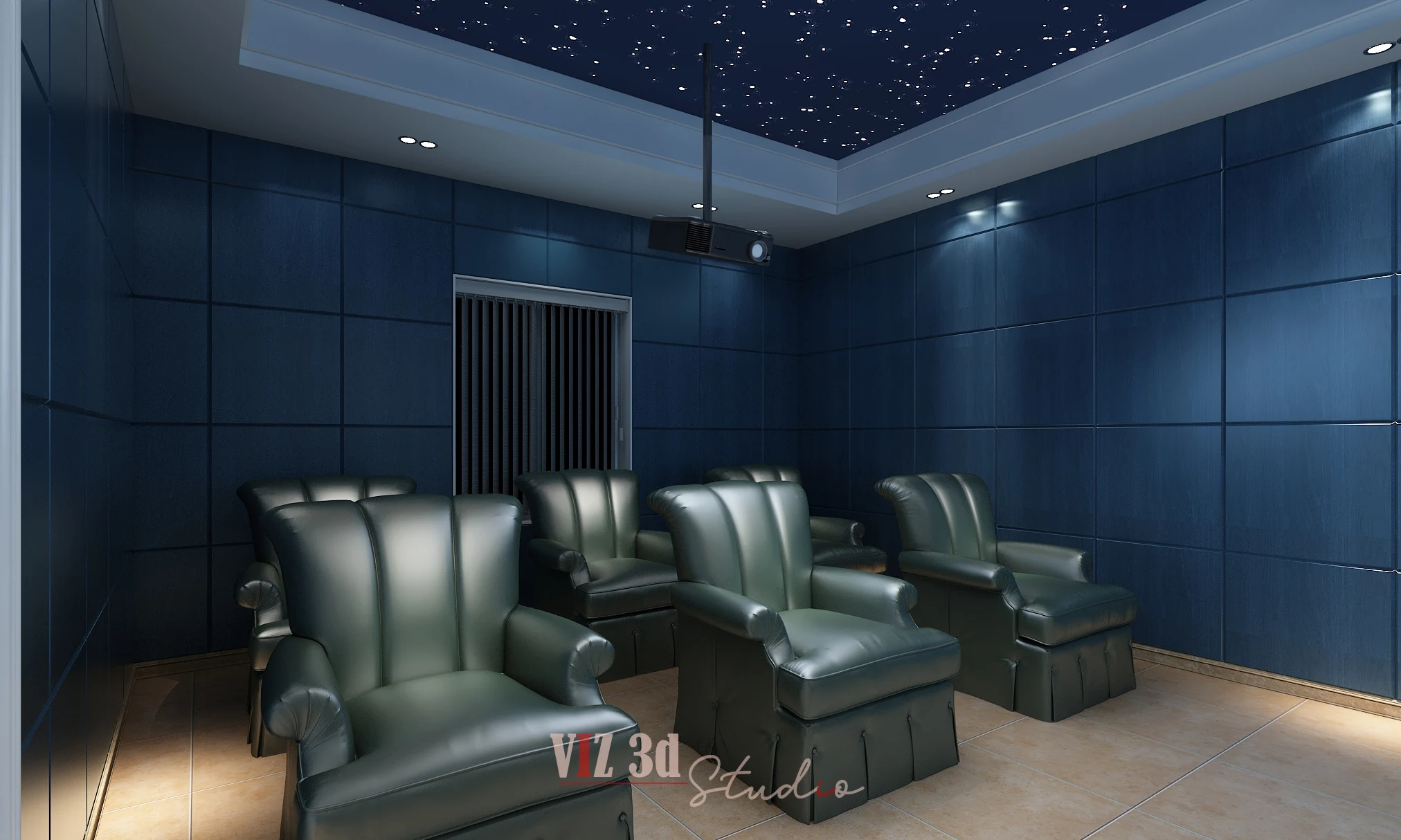 We ensured realistic texture mapping on the sound-dampening wall panels and the plush leather fabric of the recliners, capturing accurate surface depth. The lighting strategy employed subtle, low-intensity indirect lighting and fiber-optic ceiling lights, creating soft shadows essential for a true cinematic mood. The composition highlights the large screen and room proportions, showcasing visible details like the soft fabric detailing and the dark, reflective floor. This 3d architectural rendering delivered a high-resolution visual for confident client sign-off and construction.