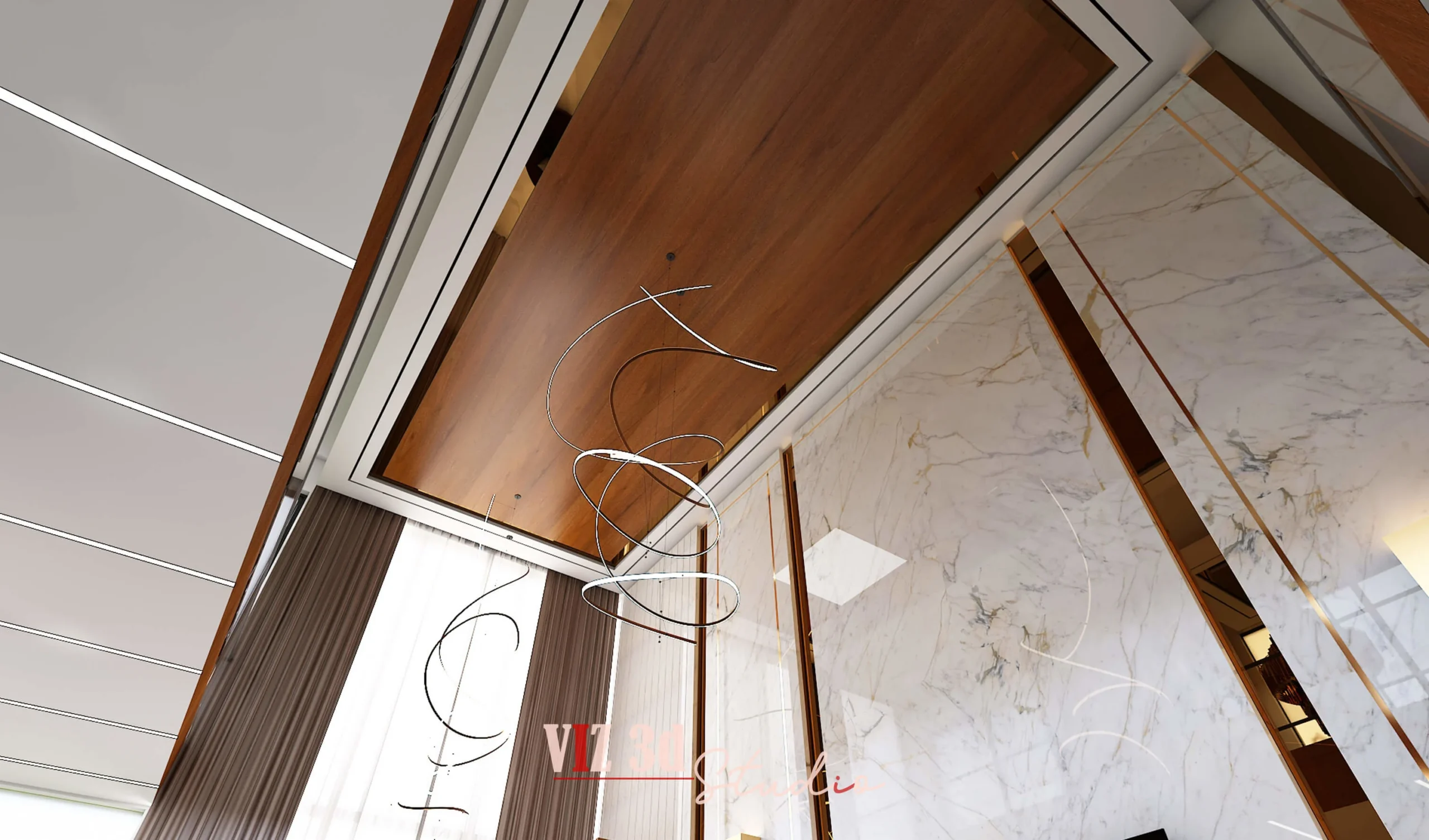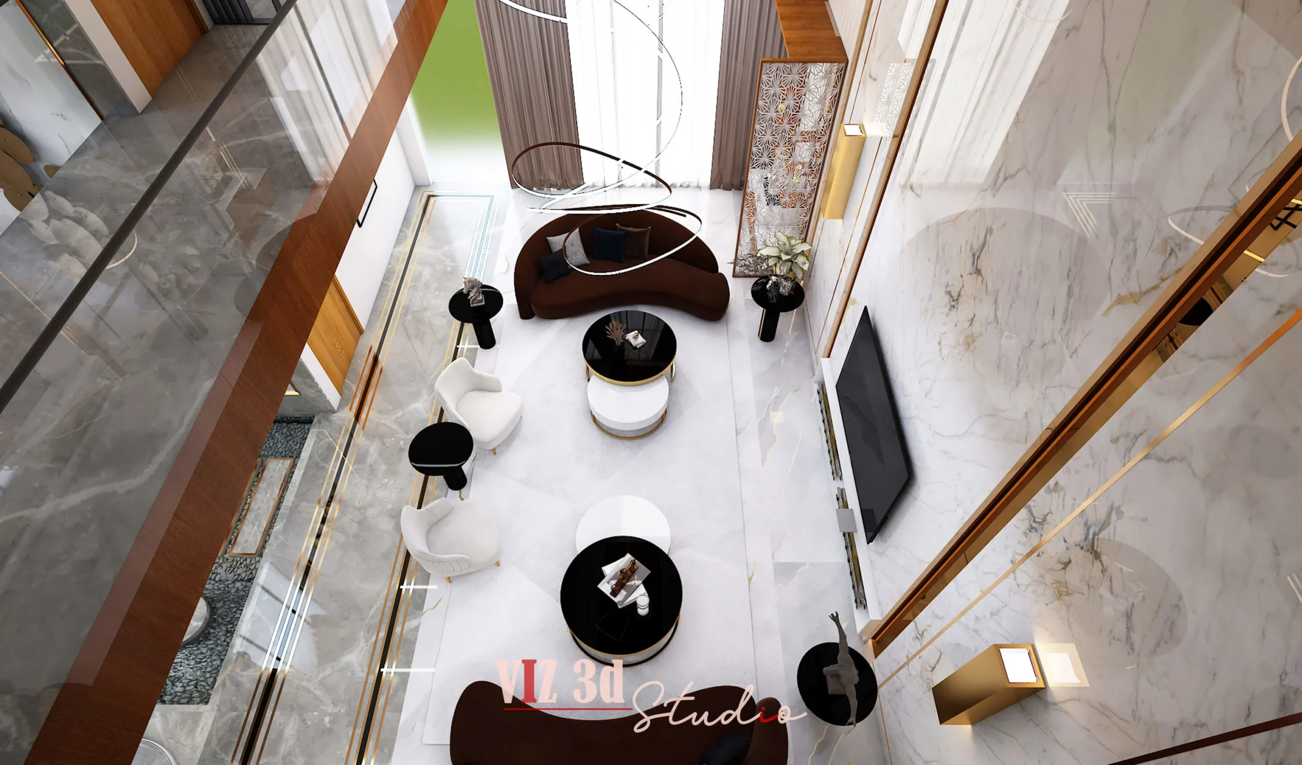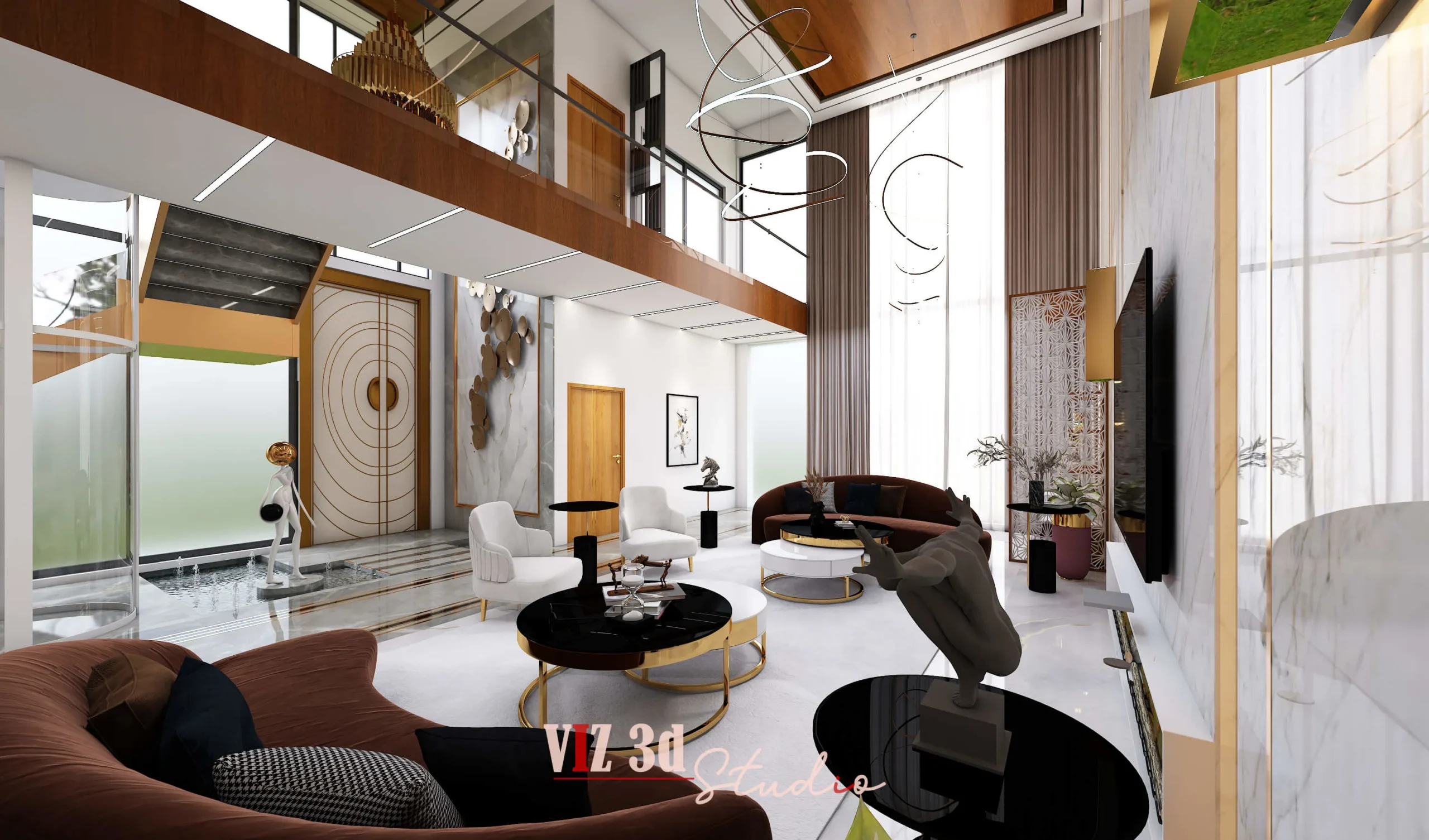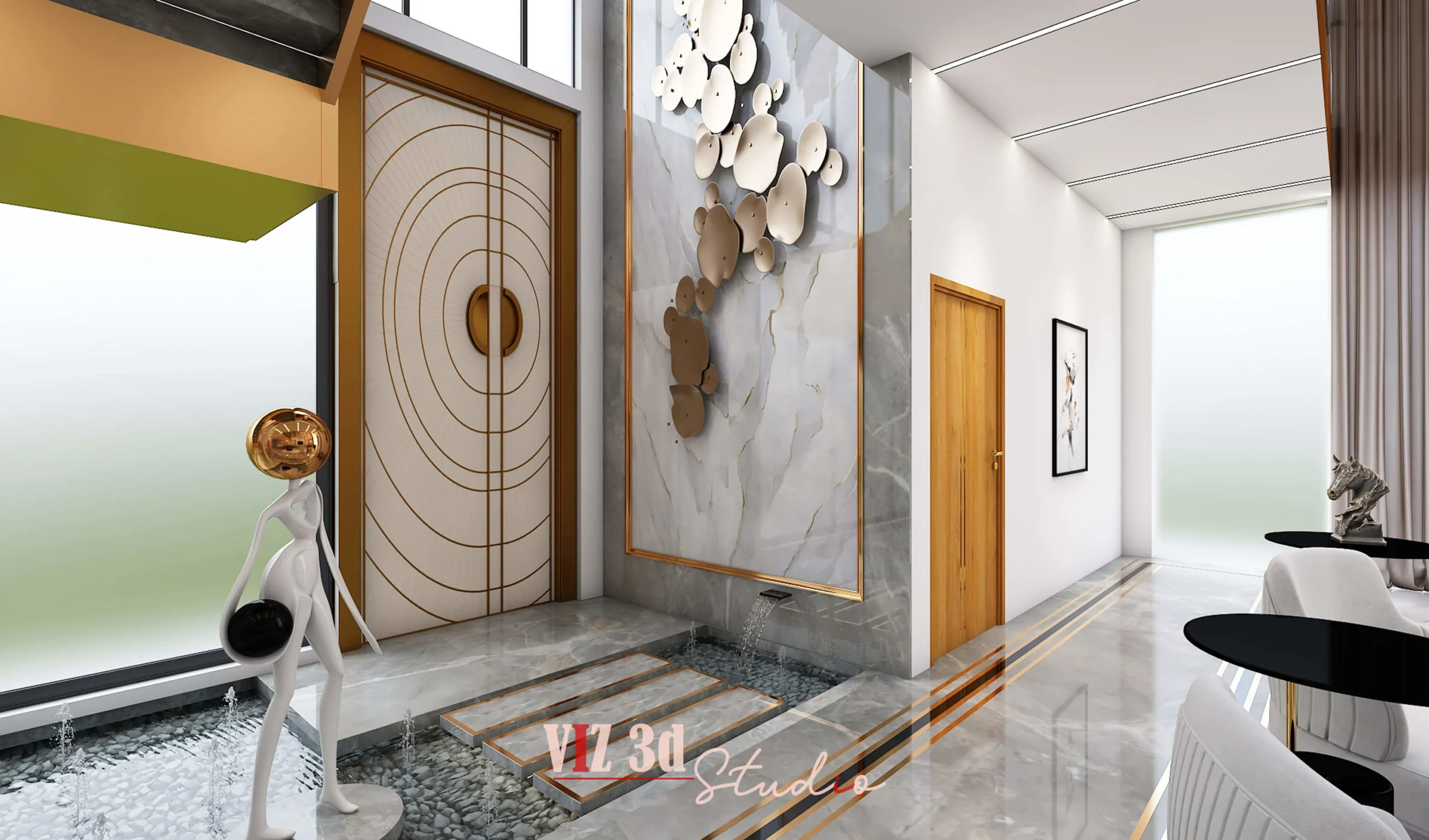 This RESIDENTIAL BUNGALOW ENTRANCE, LIVING & DINING AREA architectural visualization 3d project required premium 3d architectural rendering to showcase a grand, modern design to the architecture designer. The concept emphasizes volume and luxury using a warm, neutral palette of white marble, dark wood, and gold accents.
