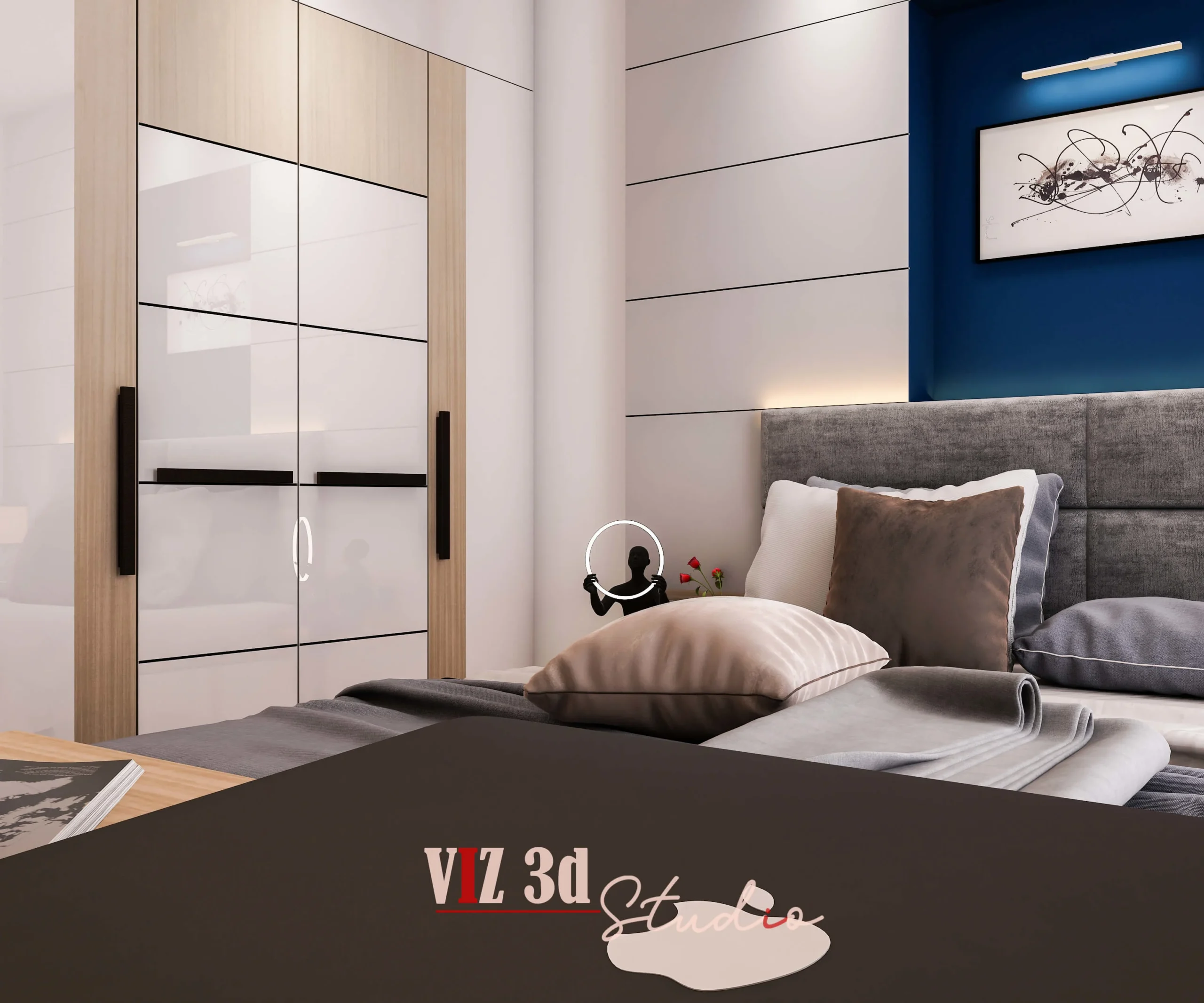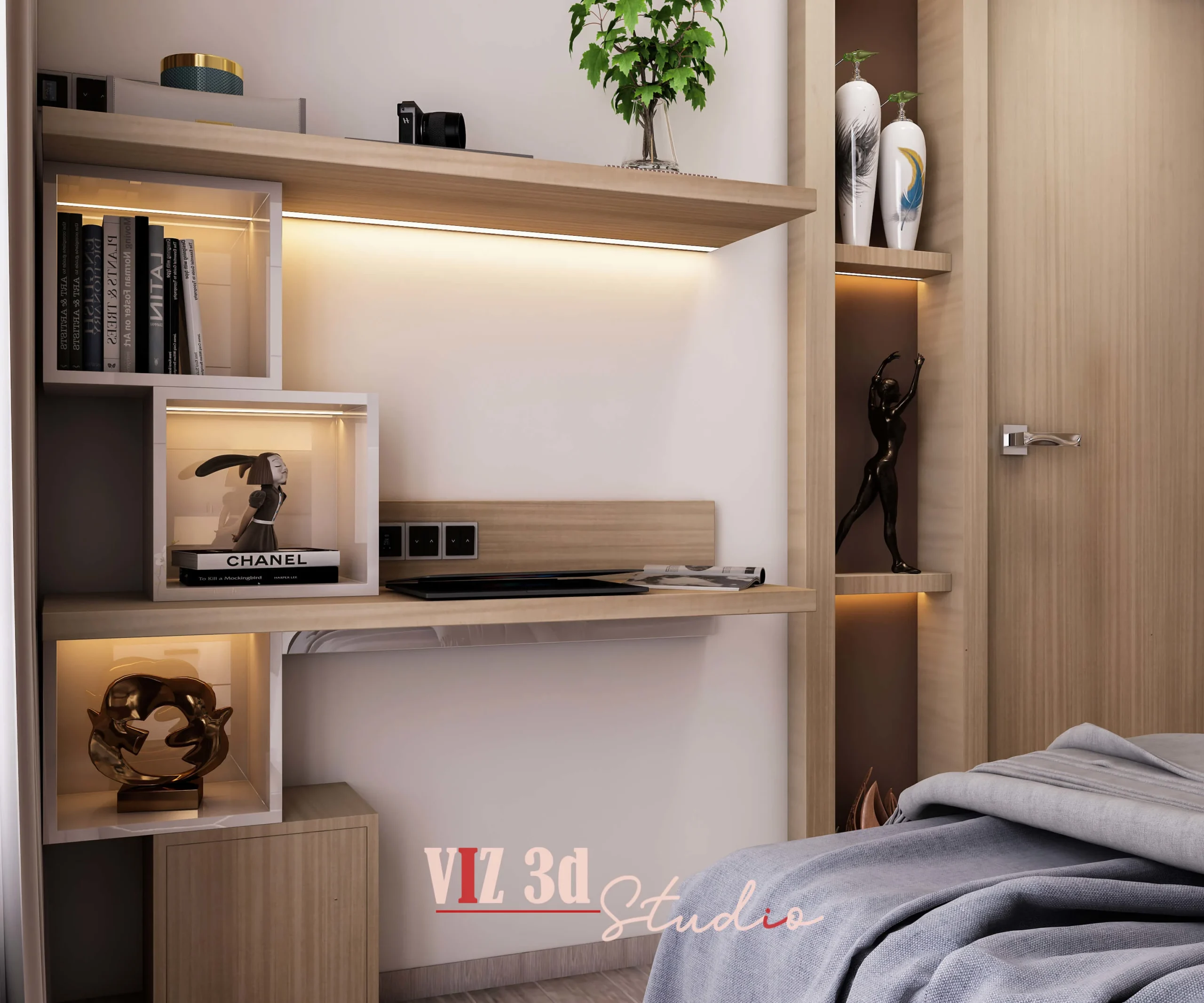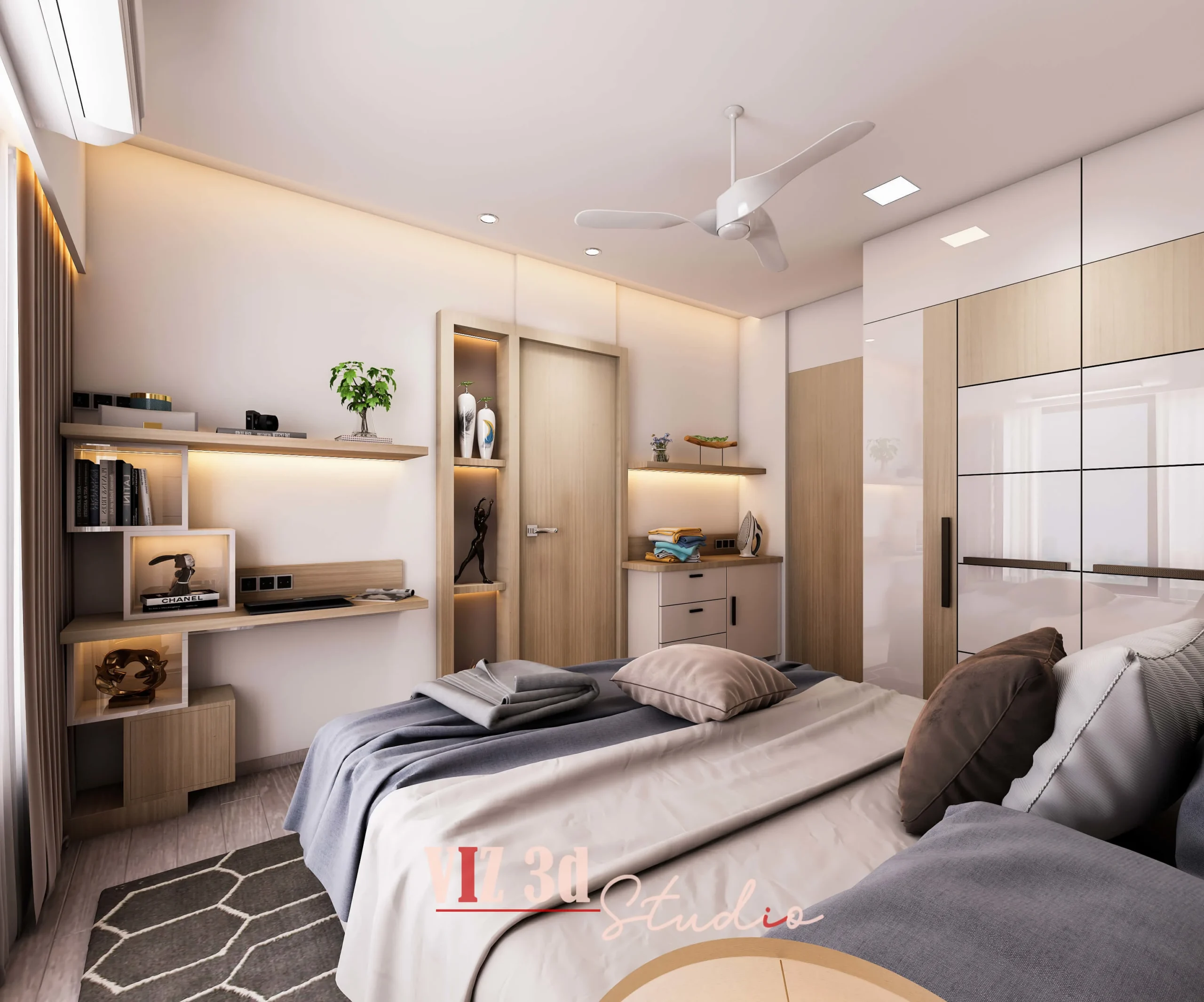 We delivered a premium 3D architectural rendering for this Master Bedroom, capturing the client’s vision for a modern, tranquil, and luxurious residential space. The objective was a high-resolution architectural visualization 3D showcase. The design features a light wood and white color palette, promoting a minimalist aesthetic with warm, indirect lighting elements (like the under-shelf LEDs) that enhance the mood and textural realism of the wood grains, fabrics, and sleek white finishes. Key details visible include the crisp reflection on the high-gloss wardrobe doors (CAM 777), the subtle fabric detailing on the bed’s headboard and bedding, and the matte finish on the decorative objects and books in the bespoke shelving unit (CAM 666).