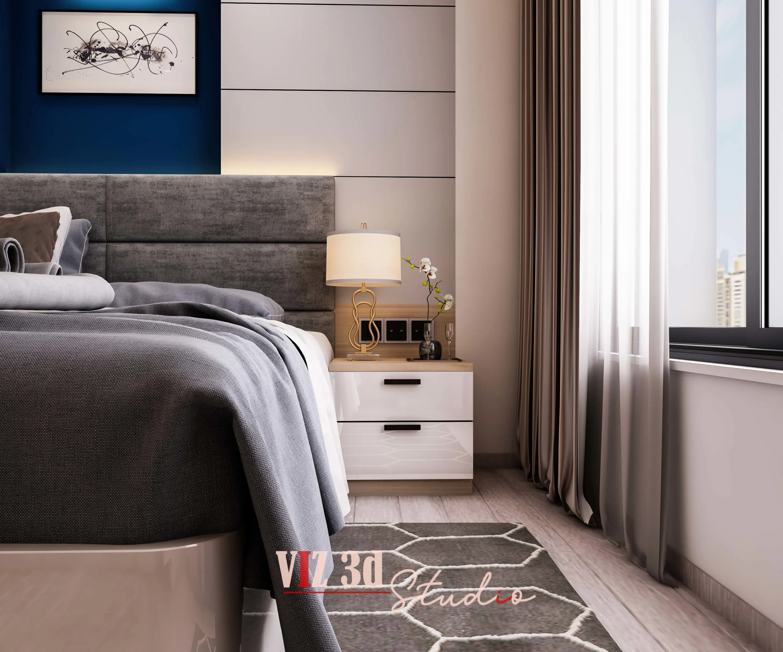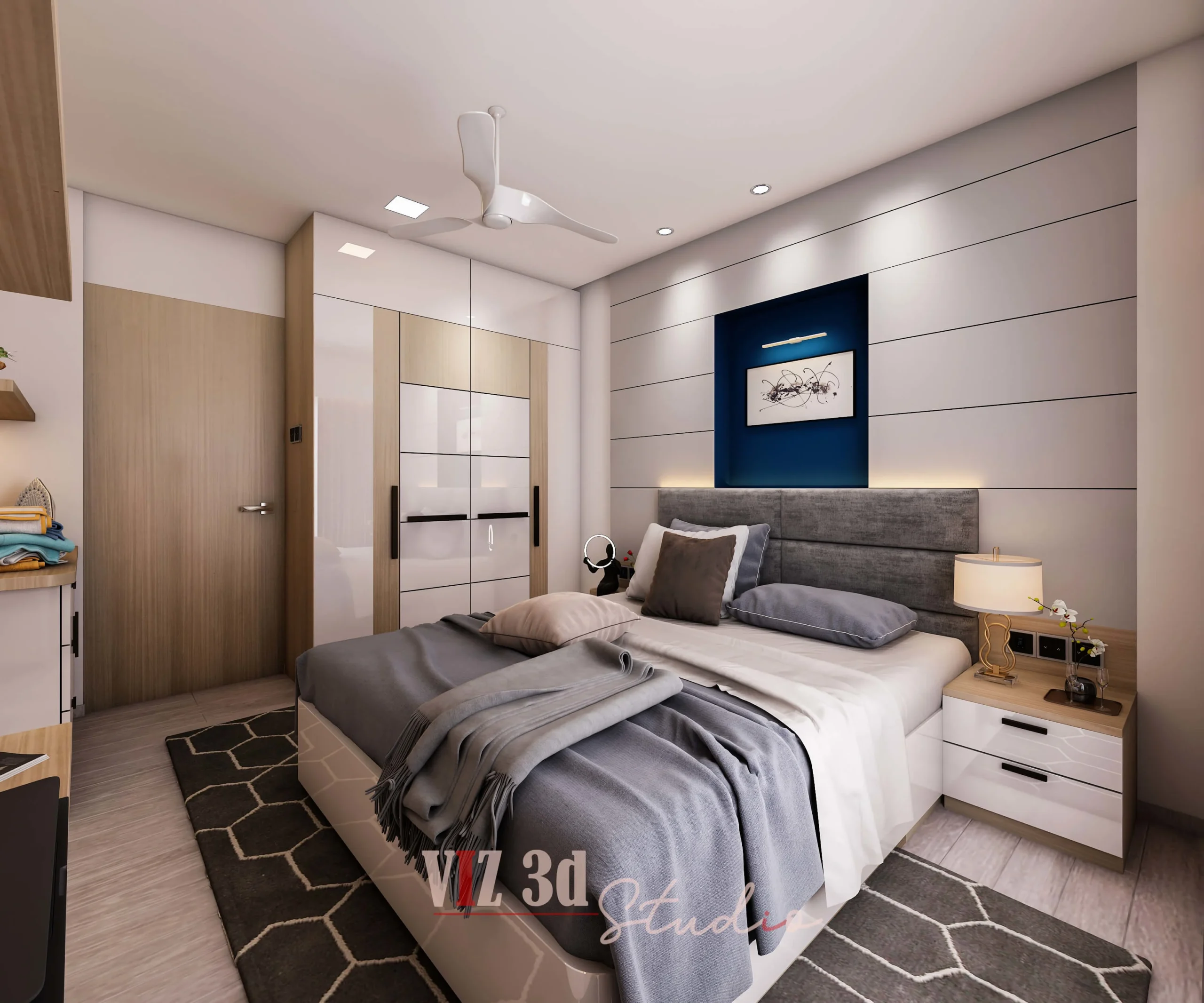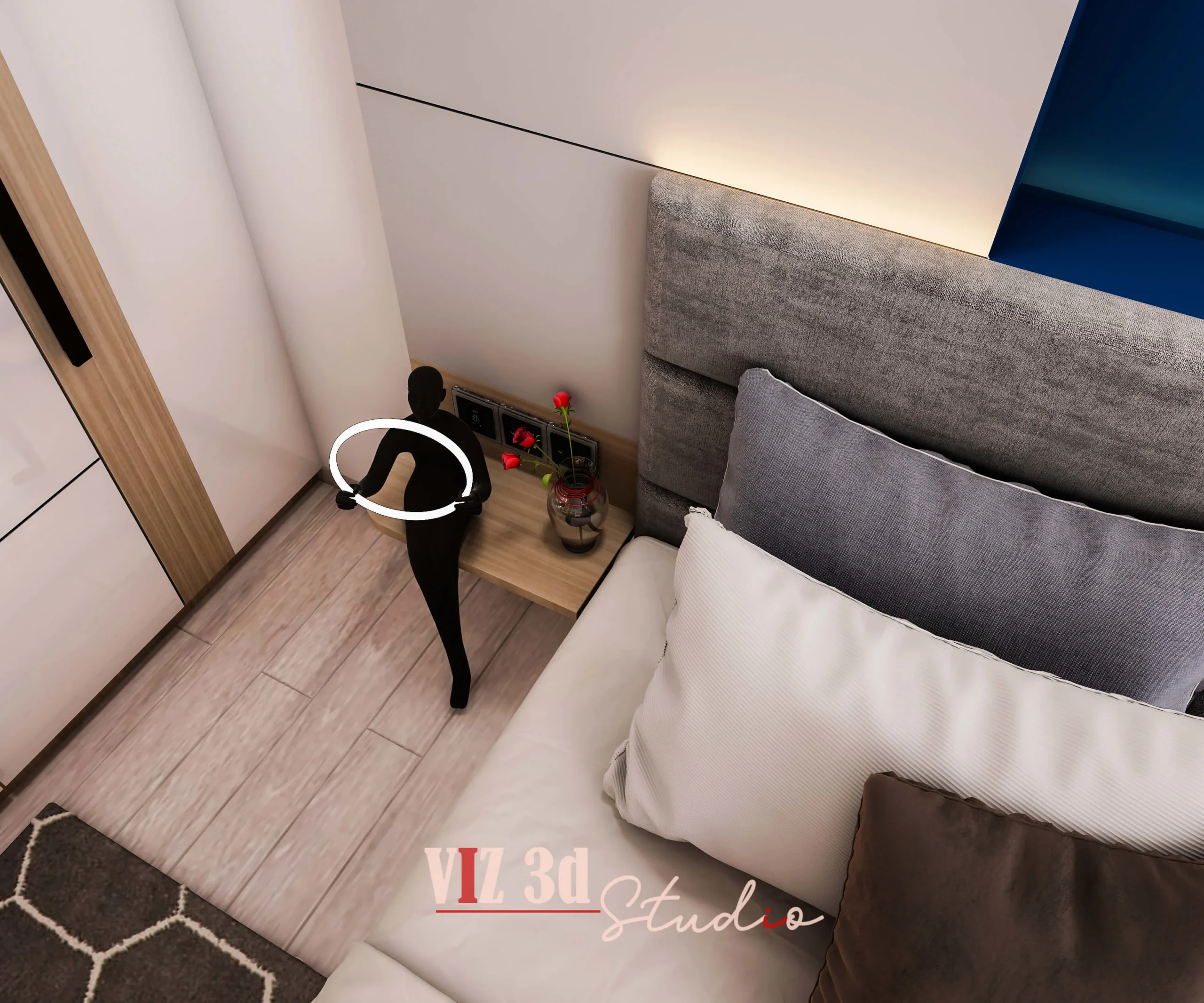 We delivered a premium 3D architectural rendering for this Master Bedroom, capturing the client’s vision for a modern, tranquil, and luxurious residential space. The objective was a high-resolution architectural visualization 3D showcase. The design features a light wood and white color palette, promoting a minimalist aesthetic with warm, indirect lighting elements (like the under-shelf LEDs) that enhance the mood and textural realism of the wood grains, fabrics, and sleek white finishes. Key details visible include the crisp reflection on the high-gloss wardrobe doors (CAM 777), the subtle fabric detailing on the bed’s headboard and bedding, and the matte finish on the decorative objects and books in the bespoke shelving unit (CAM 666).
