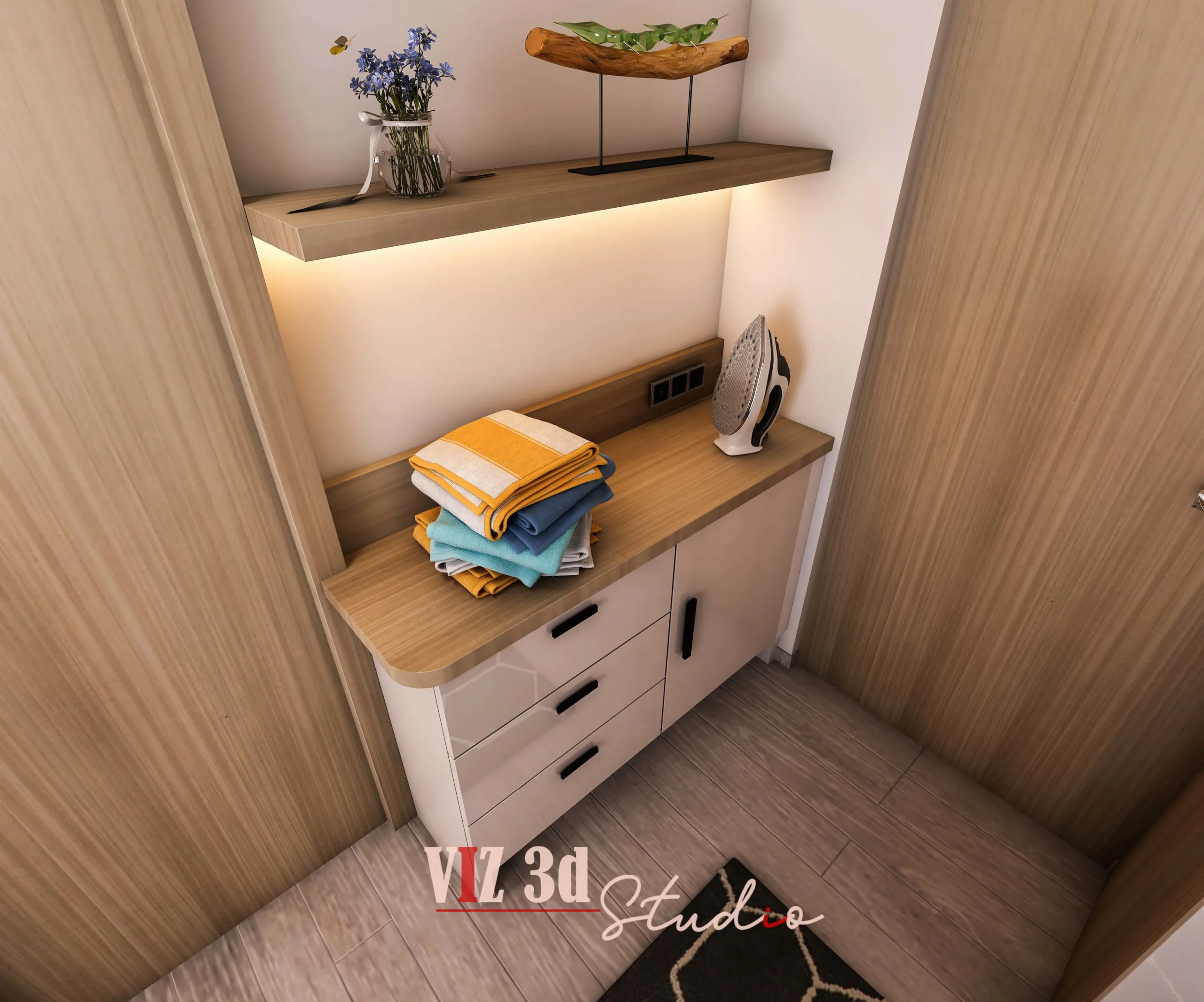 The camera angles were strategically chosen for maximum impact: a close-up on the stylish shelving/desk area highlights the design and functionality (CAM 666), a medium shot centers on the plush bed and expansive wardrobe, conveying space and comfort (CAM 777), and an elevated view captures the compact, well-designed laundry/dressing nook with folded linens and an iron, emphasizing practical luxury (CAM 888). Through meticulous texture mapping and a bright lighting strategy with soft shadows, we achieved perfect material depth and proportion, ensuring the final output offered an immersive, business-ready presentation of the architecture designer’s plan.