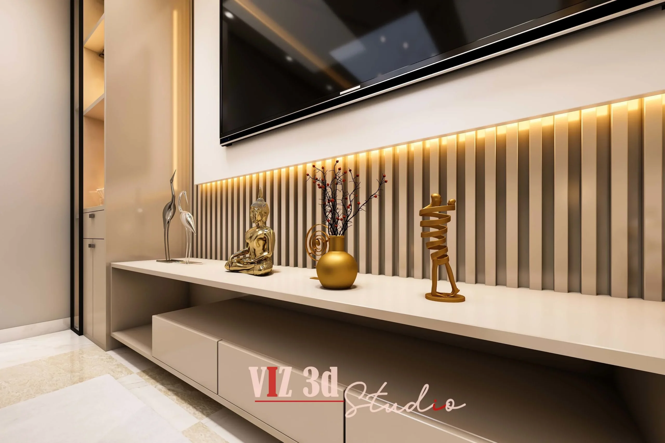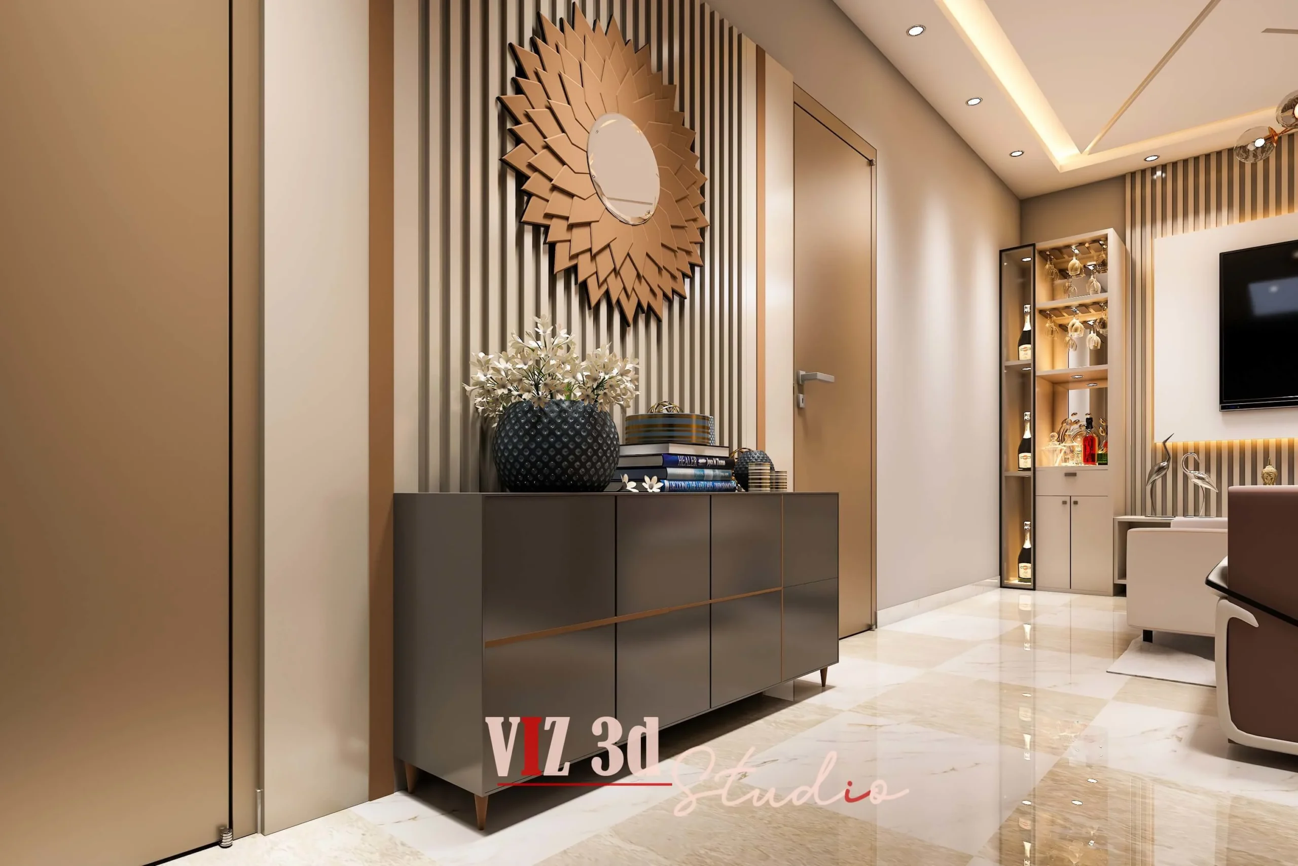 This RESIDENTIAL arch rendering project delivered a high-impact 3d rendering home visualization for a modern LIVING ROOM. The client sought a luxurious, warm design featuring contemporary furniture and a rich color palette of mauve, cream, and gold. The creative direction emphasized integrating a custom bar unit and TV wall with intricate gold details (CAM 1.jpg). We executed meticulous texture mapping on the mauve sofa fabric and the complex marble-effect wallpaper, ensuring realistic surface depth. The lighting strategy employs warm cove lighting (indirect lighting) and decorative gold ceiling fixtures, complementing the bright ambient light and enhancing the luxury feel. The wide-angle camera shot (CAM 1.jpg) captures the integrated space planning, while the close-up (CAM 4.jpg) highlights visible detailing like the reflections on the gold-framed marble coffee table and the subtle sheen on the leatherette sofa. This high-resolution visualization provided the client with essential presentation quality, ensuring accurate representation of the bespoke design elements.