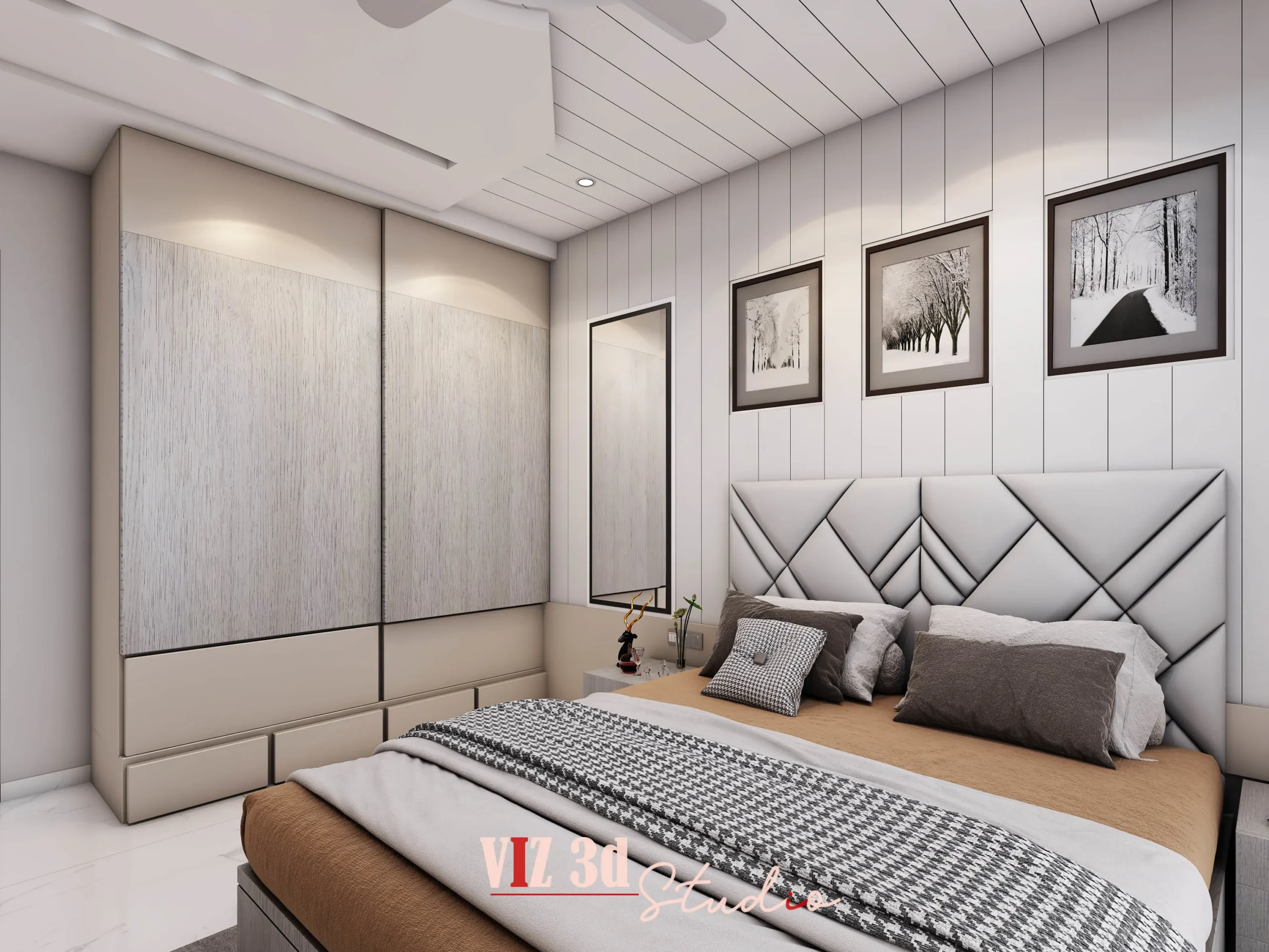 This high-quality 3D architectural rendering for the GUEST BEDROOM successfully visualizes the architecture designer’s brief for a modern, serene, and functional space, achieving a compelling architectural visualization 3D. The concept centers on a clean, minimalist design using a neutral color palette of whites, light grey wood textures, and warm tan accents.