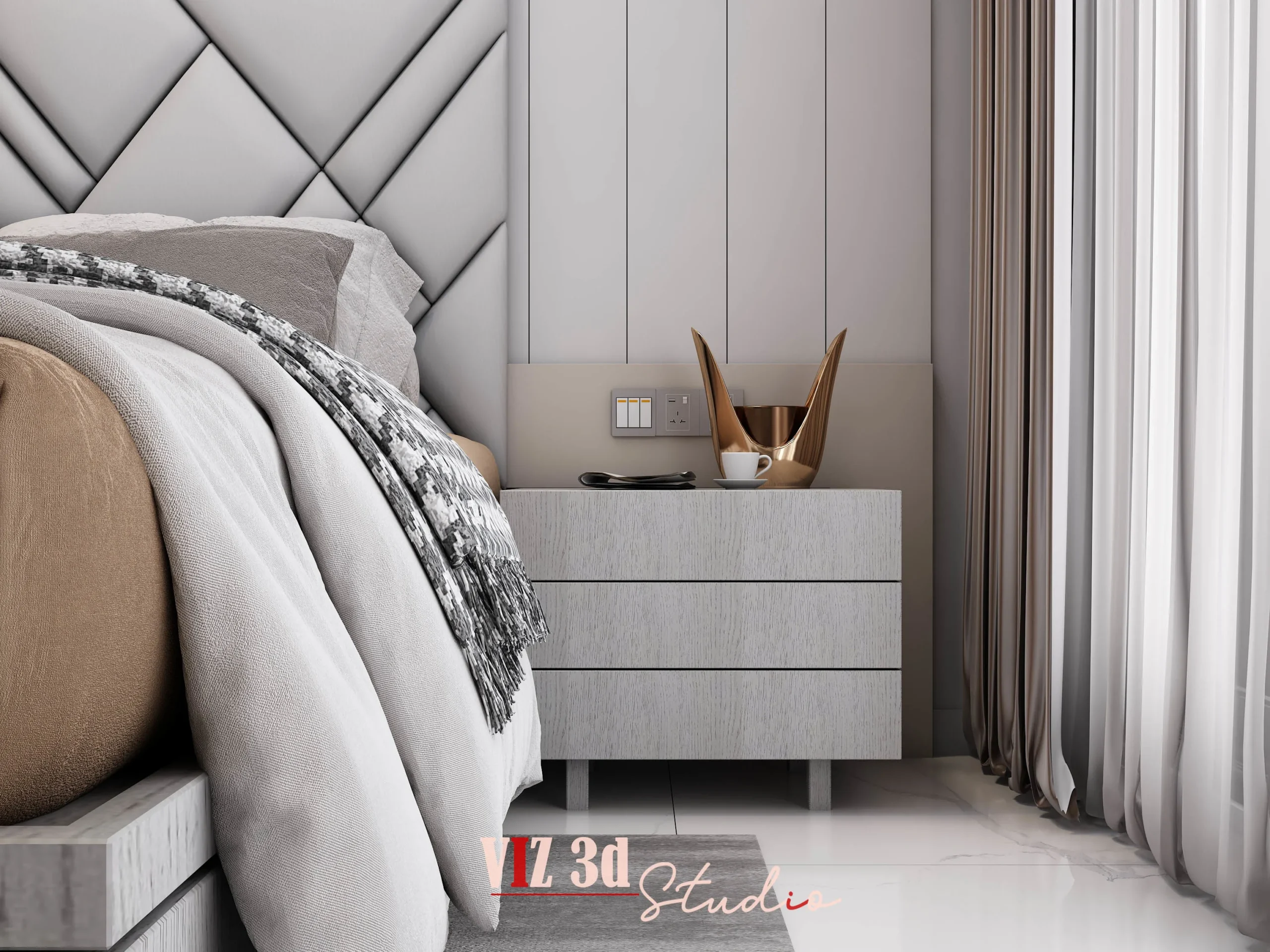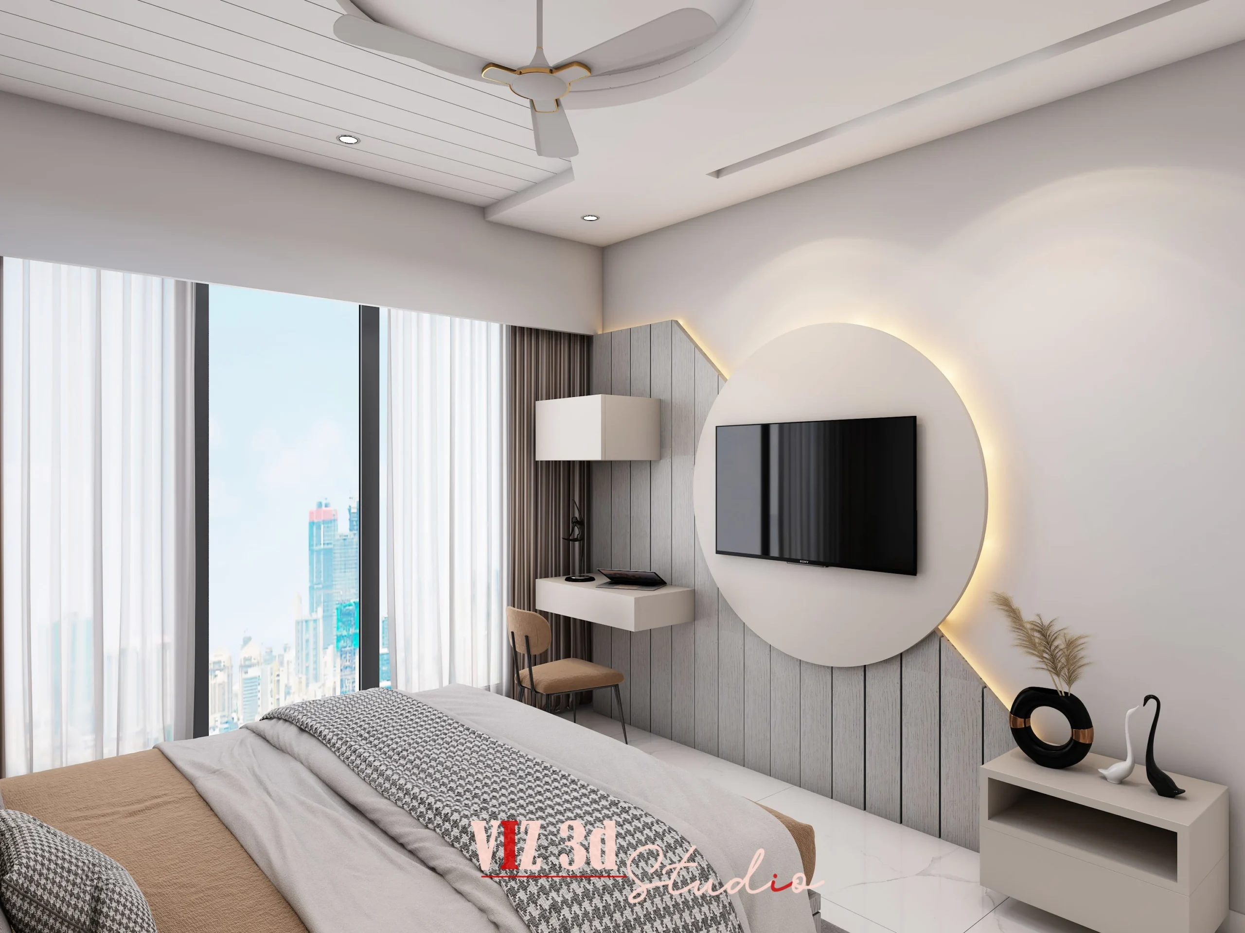 Our lighting strategy incorporates natural daylight, diffuse sheer curtains, and warm indirect lighting from the circular wall feature (FINAL CAM 3) and ceiling coves, optimizing the ambience. The camera angles focus on highlighting the room’s key features: the geometric upholstered headboard with precise fabric detailing (FINAL CAM 2) and the custom TV unit/desk setup that makes excellent use of space (FINAL CAM 3). Meticulous texture mapping captures the subtle grain on the light wood panels, the soft fall of the curtain fabric detailing (FINAL CAM 4), and the clean reflection in the full-length mirror (FINAL CAM 2), delivering a high-resolution, presentation-ready final output for the client.