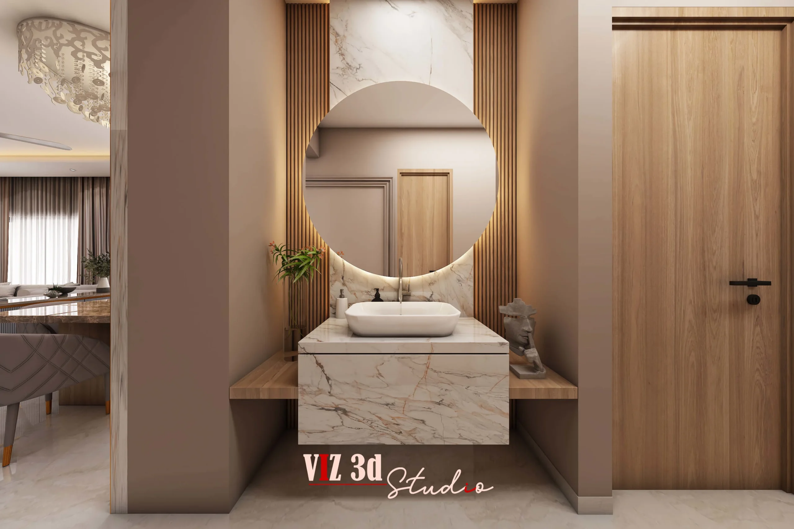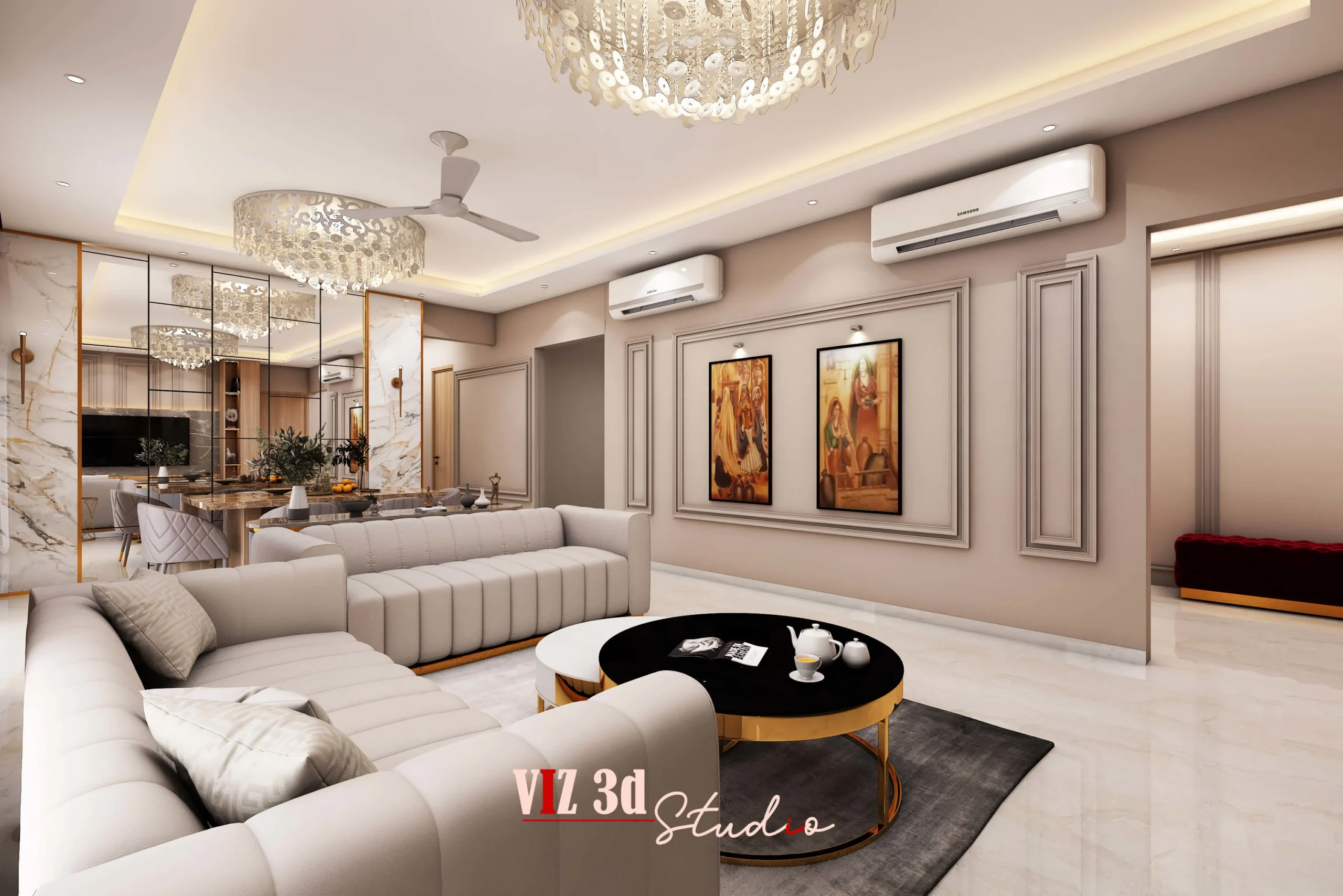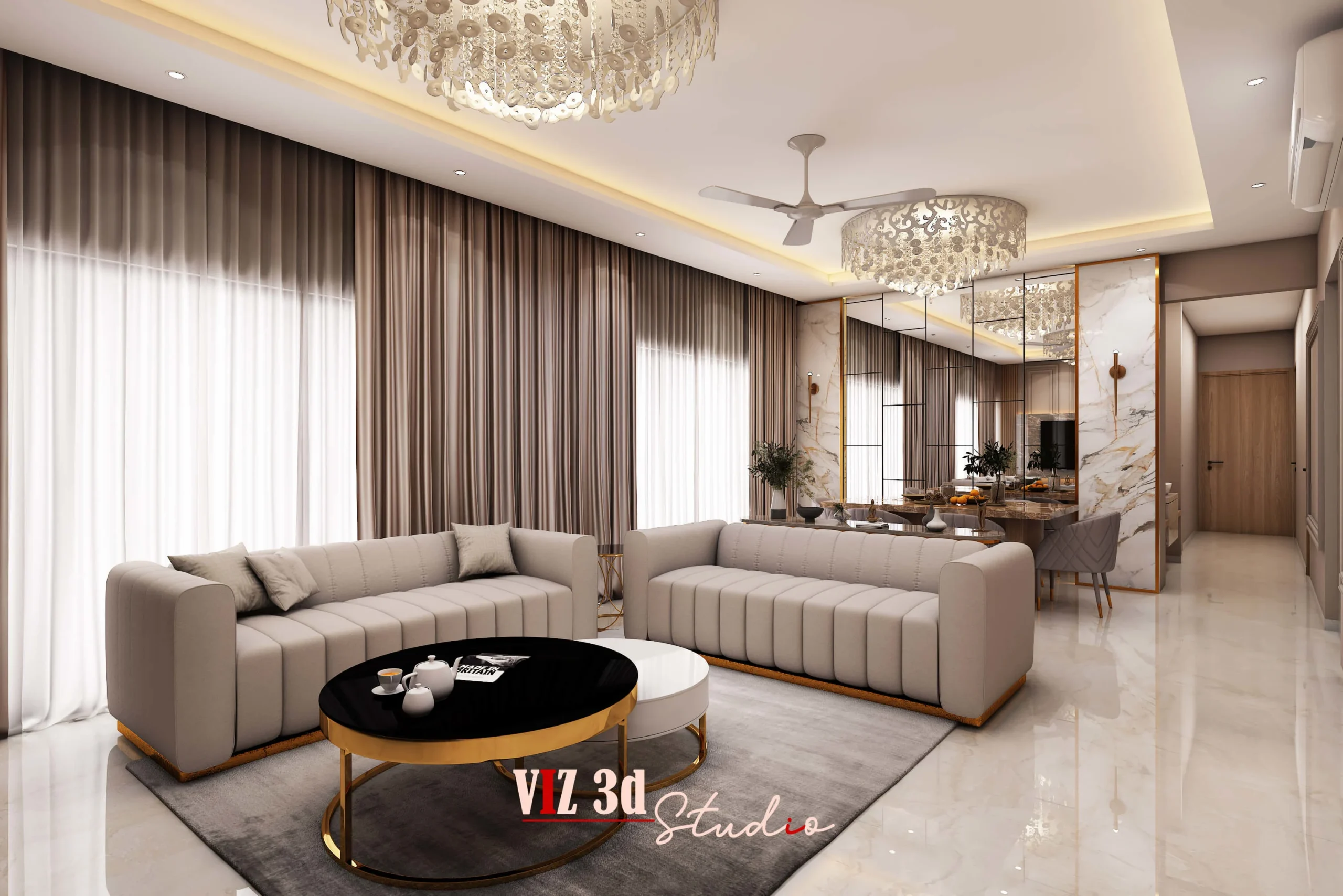 This 3D architectural rendering for the LIVING ROOM aimed to capture the architecture designer’s vision for a highly luxurious and contemporary residential space, providing a detailed architectural visualization 3D. The design aesthetic emphasizes a neutral, warm color palette—taupes, light greys, and cream—accentuated by striking gold metallic details and high-gloss marble finishes for a premium, opulent feel.