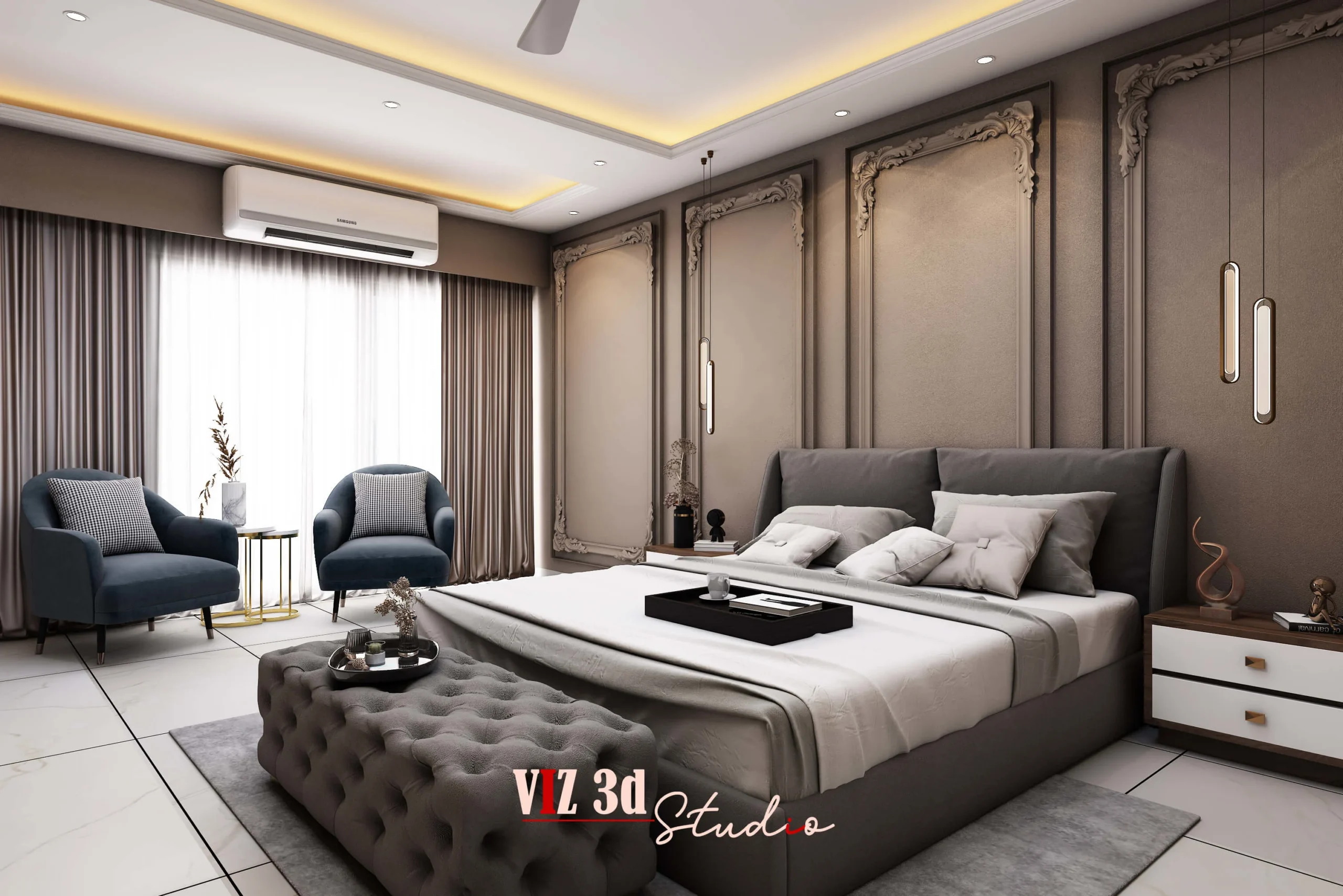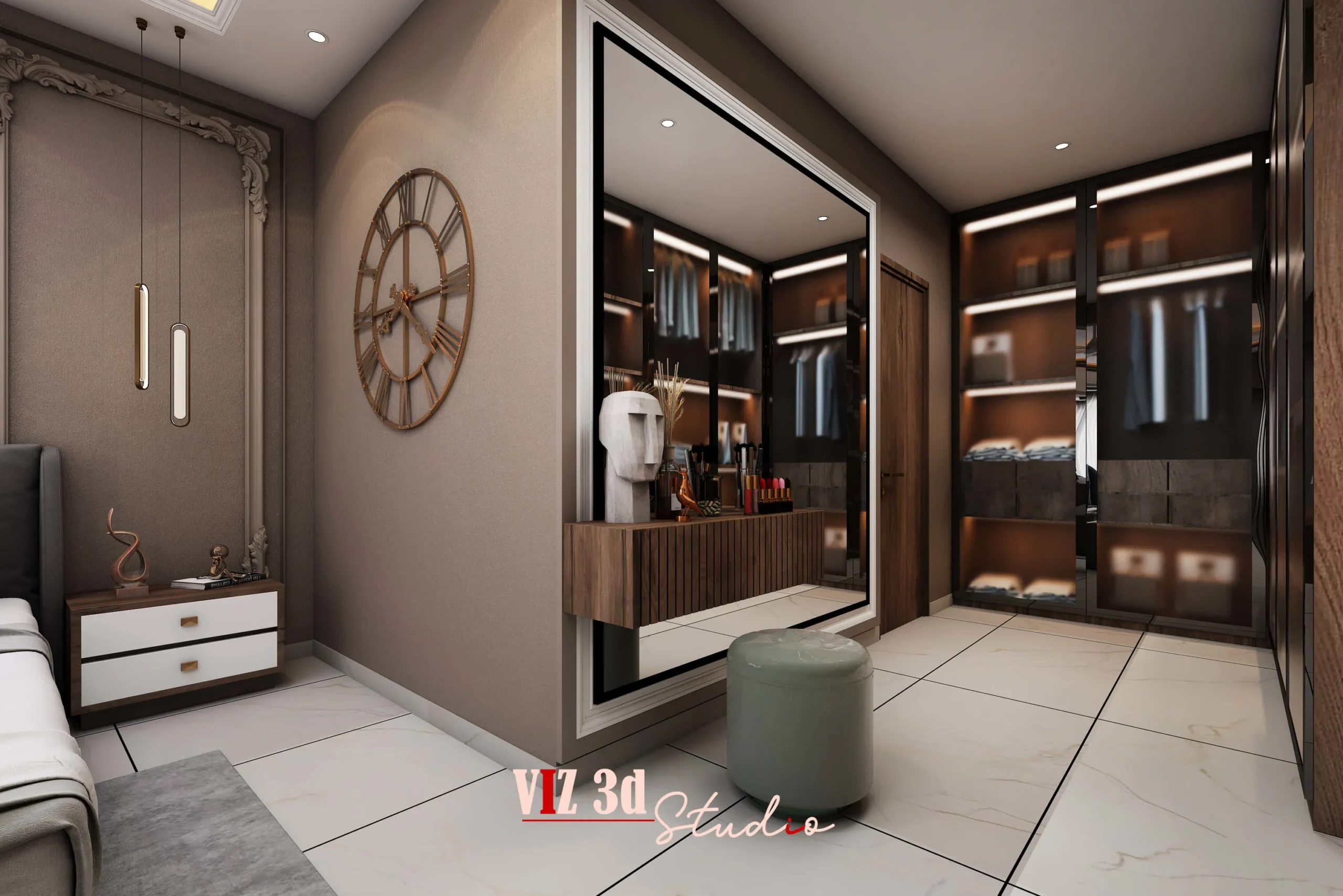 This RESIDENTIAL MASTER BEDROOM architectural visualisation project delivers a warm, luxurious design using a palette of grey velvet, neutral taupe, and light wood, presented through high-quality arch rendering. The objective was to showcase the opulent feature wall and walk-in closet connection. The creative direction focused on neoclassical detailing mixed with modern comfort. We achieved realistic texture mapping on the velvet headboard and the smooth marble floor, ensuring material detailing and surface depth were accurate (CAM 2.jpg). The lighting strategy utilized soft, warm perimeter cove lighting and dramatic pendant lights (CAM 2.jpg) that highlight the classic molding details, enhancing the room’s mood. Camera angles capture the customized dressing mirror/console and the open walk-in wardrobe, verifying space planning (CAM 3.jpg). Visible detailing includes the metallic shine on the clock frame, the soft fabric detailing of the cushioned ottoman, and the crisp reflections in the large mirror, providing the client with a premium 3d rendering home visual for construction validation and presentation.