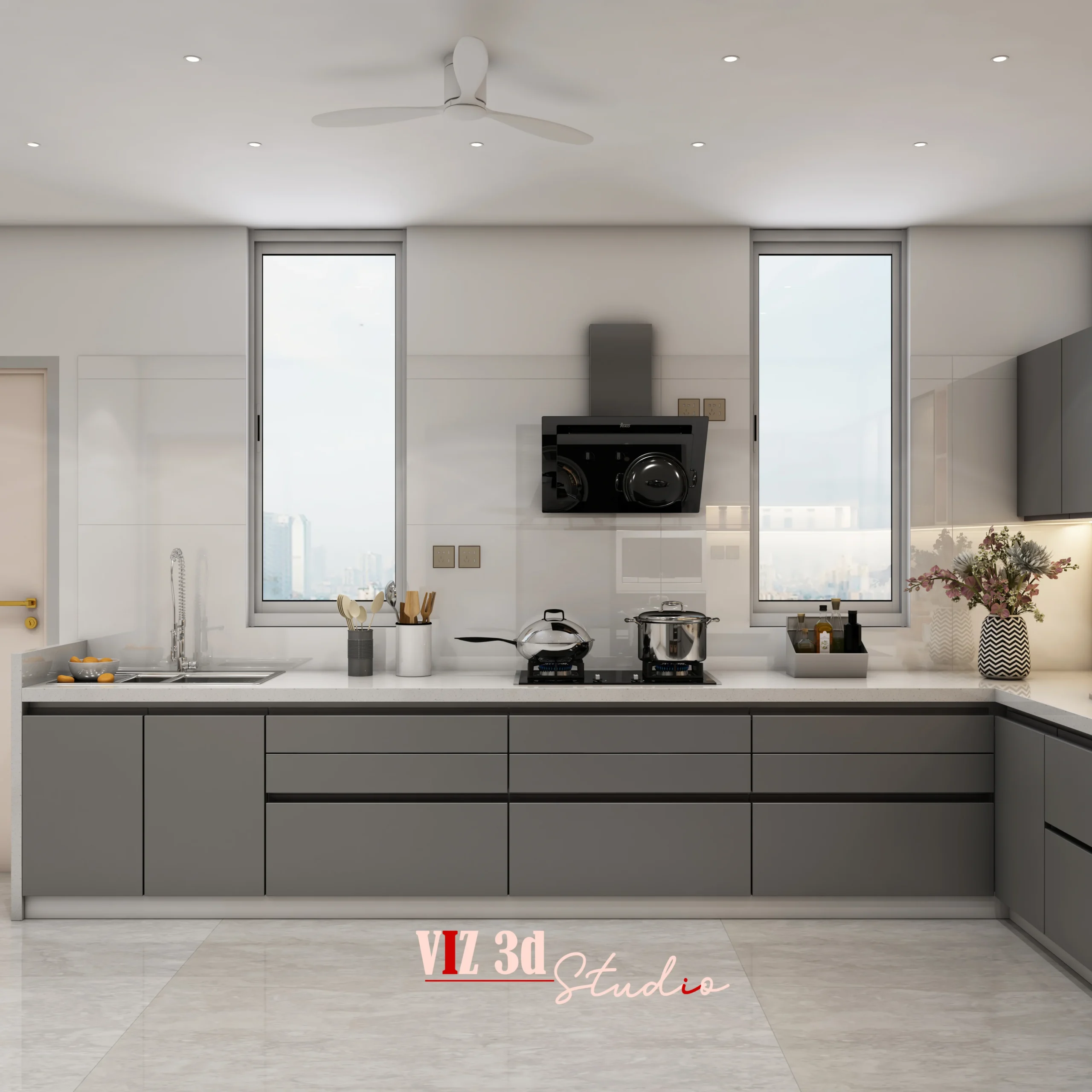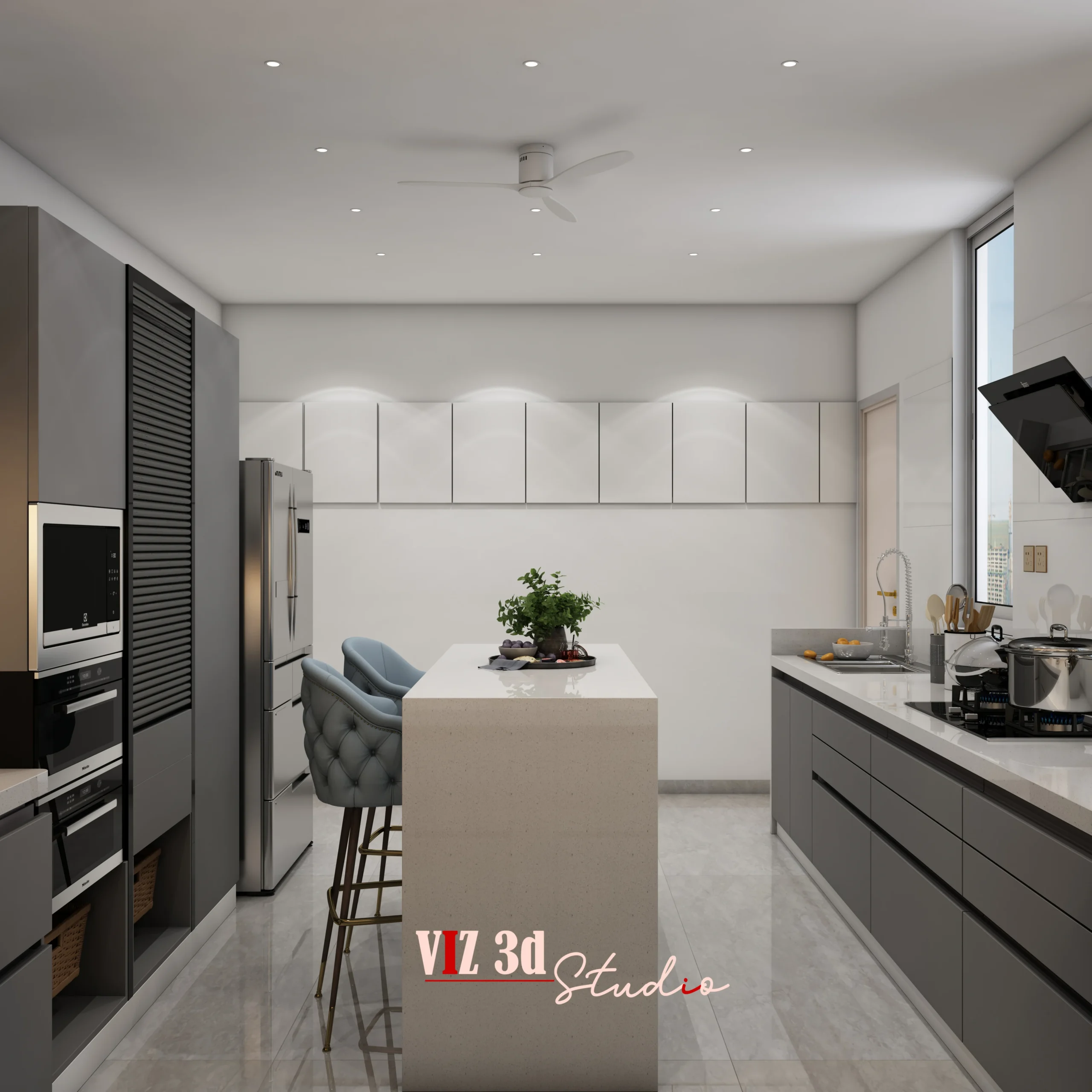 The Kitchen 3D visualization project was designed to present a modern, functional, and visually refined kitchen space that allows the client to clearly understand the final design before execution. The objective was to create a clean, realistic presentation using 3D architectural visualization, developed by a professional 3D architectural visualization studio in Mumbai, with a strong focus on accuracy and premium aesthetics. The concept follows a minimal, linear layout that enhances workflow and visual balance, featuring matte grey cabinetry, seamless countertops, integrated appliances, and subtle wall finishes. Realistic texture mapping and material detailing add depth and surface realism, while soft HDRI daylight combined with indirect ceiling lighting creates natural shadows, reflections, and a bright, welcoming mood. Carefully selected eye-level camera angles highlight proportions, symmetry, and spatial clarity. Environmental elements such as large windows, city views, curated accessories, and indoor plants enhance realism. The neutral grey and white color palette delivers a contemporary, elegant feel, resulting in a high-quality visual asset that strengthens client presentations, supports decision-making, and adds strong brand value.