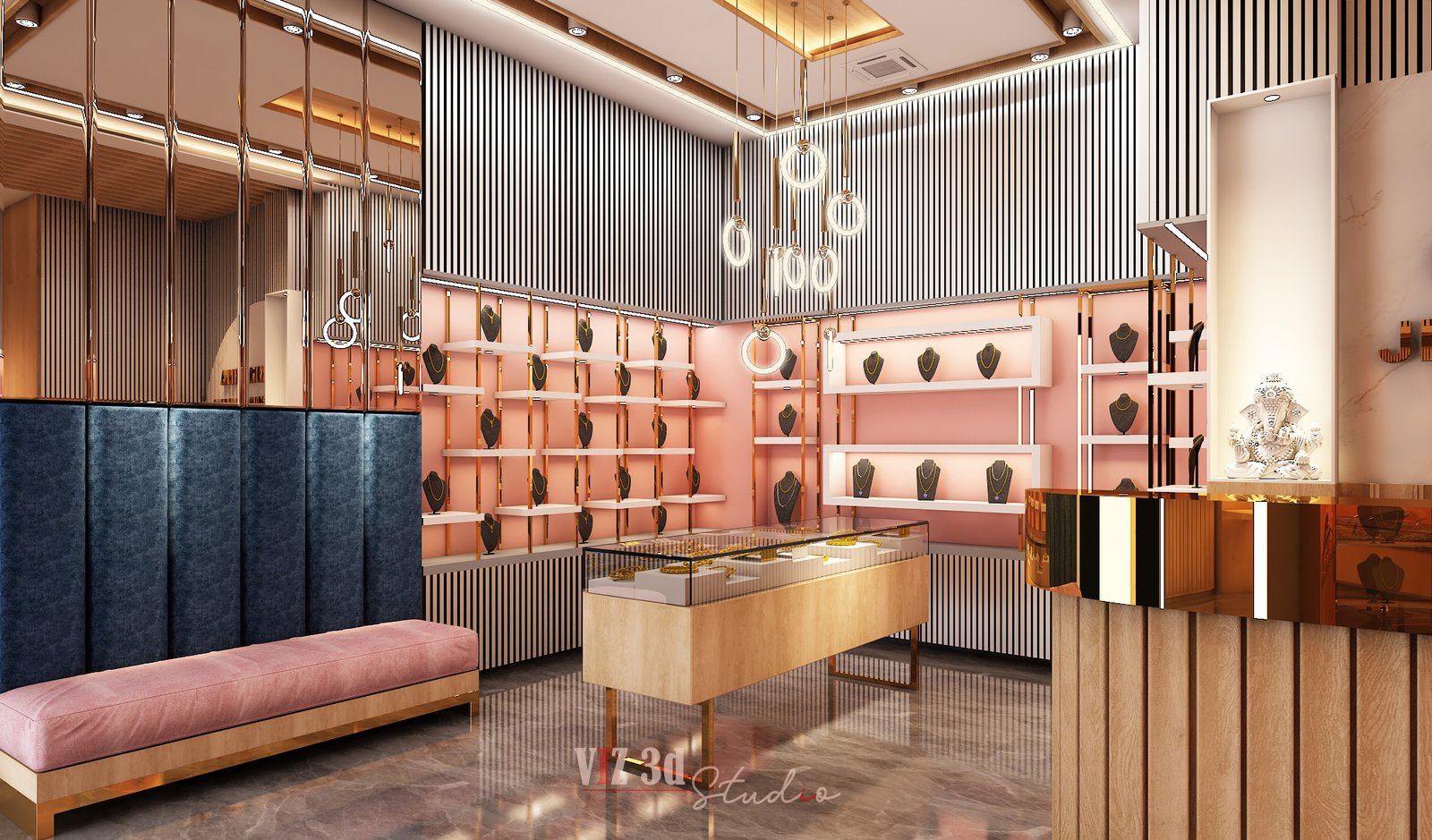 This RETAIL JEWELLERY SHOWROOM arch rendering project required a luxurious and premium visualization to boost brand appeal, executed by our expert 3d visualiser. The creative direction emphasized a warm, feminine palette using blush pink, ribbed white walls, light wood, and high-shine gold accents. We ensured precise texture mapping on the marble flooring and the fine vertical paneling. Camera angles captured the full sales floor, highlighting bespoke elements like the wood display cases and the soft velvet seating area.