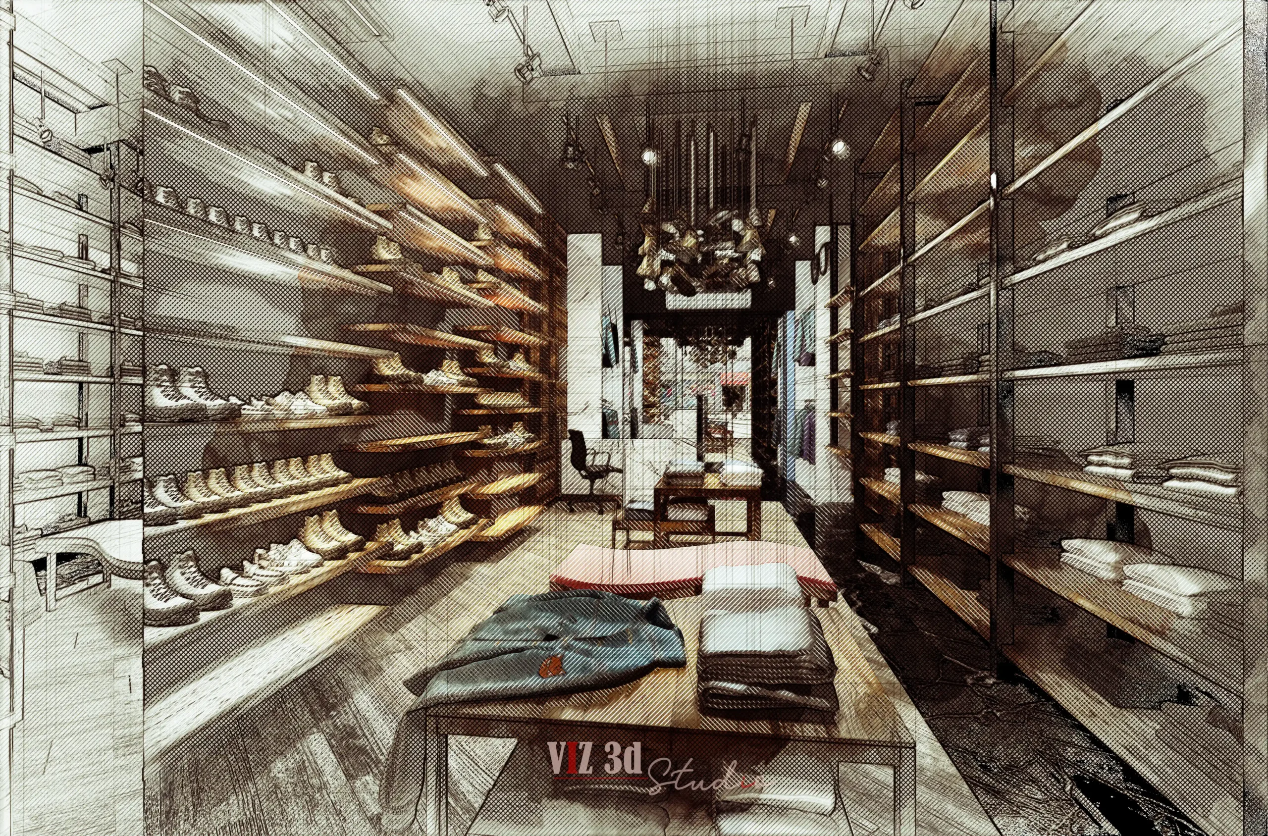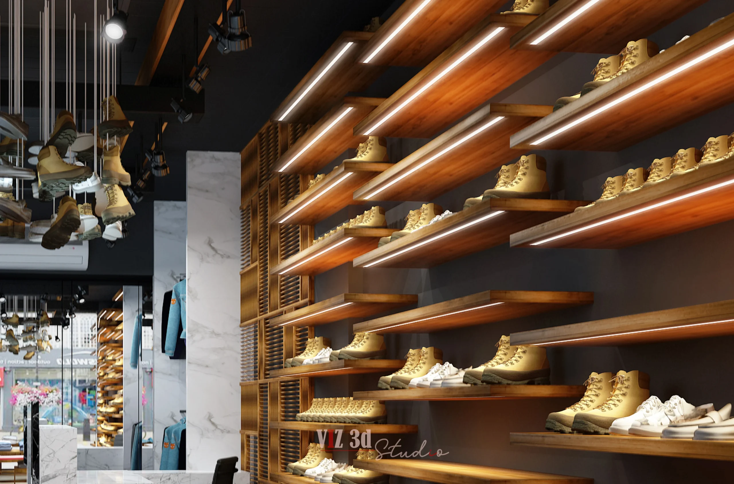 This architectural 3D design project for a RETAIL MEN’S BOUTIQUE focused on realizing a raw, rugged aesthetic to significantly enhance the brand’s value for both marketing and construction visualization. The core creative concept relied on a dramatic contrast between dark elements, such as the black ceiling and marble floor, and warm, natural wood features. Our photorealistic 3D rendering achieved a high degree of realism through precise mapping of the wood grain and ensuring the black marble flooring exhibited accurate reflections and surface depth. The complex lighting scheme was executed using focused track lighting and integrated illuminated strips within the shelving, which served to dramatically highlight the showcased merchandise, including shoes and clothing.